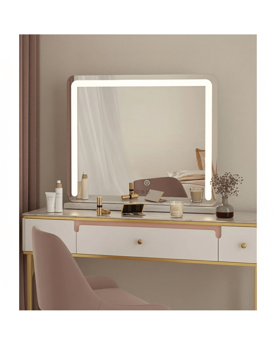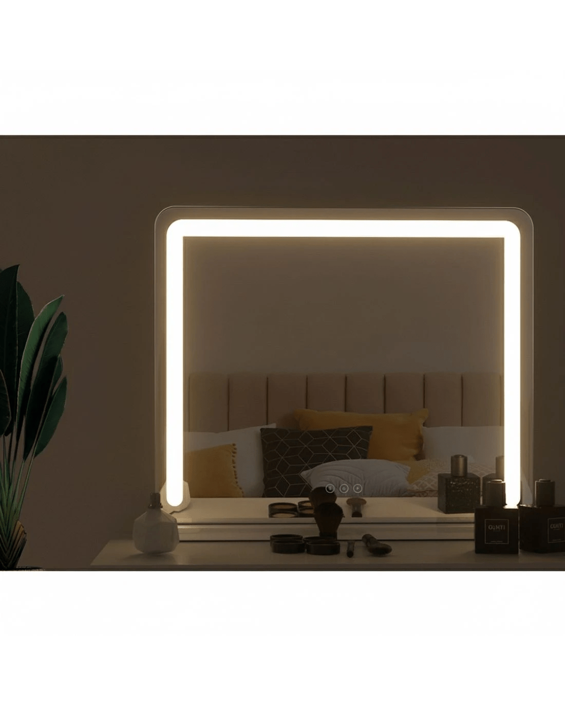 Get the star treatment with our gorgeous Embellir Make-up Mirror. Framed with bright LED stripe lights, this mirror really lights up your visage through your daily makeup regimen. The aluminium frame is sturdy, lightweight, and adds a touch of glamour to the entire mirror. The frame sits on an equally smooth powder coated MDF base for stability and durability. Put it straight on your existing vanity or mount to the wall for additional space. Even more wonderful is that the LED light can be easily adjusted for brightness and colour temperature using our intelligent touch controls. Turn your bedroom or bathroom into a celebrity set overnight with our Embiller Make-up Mirror, and enjoy beauty in all its illuminated brilliance.