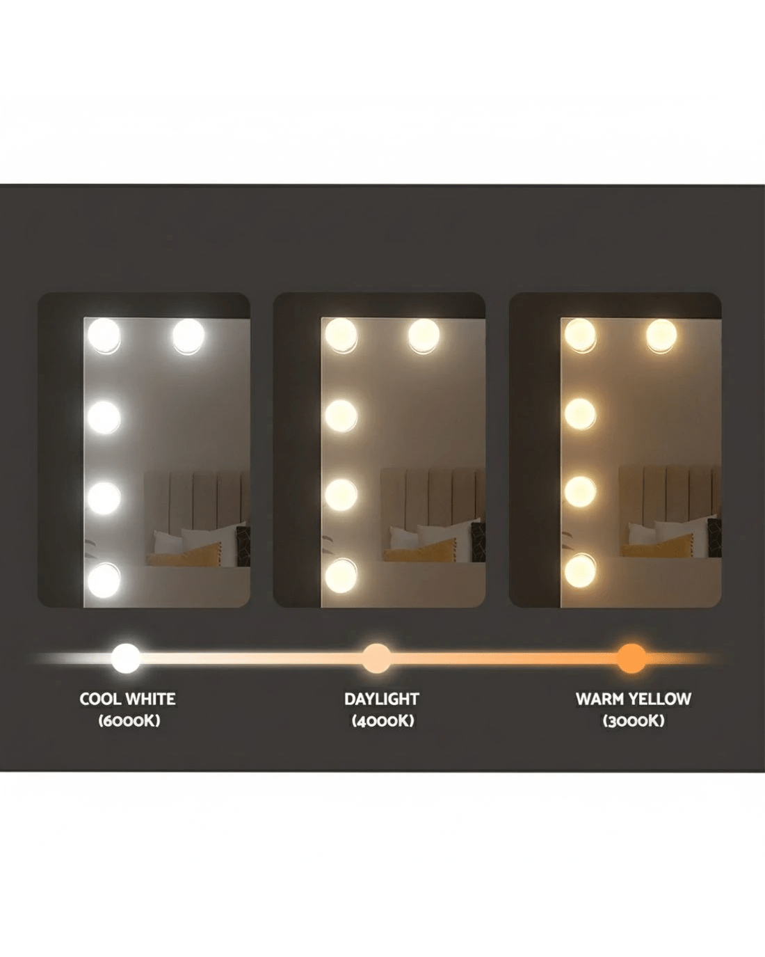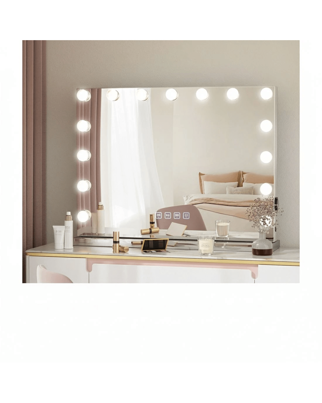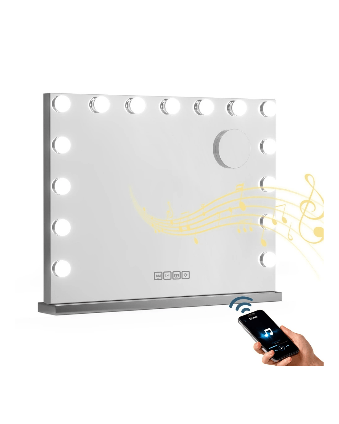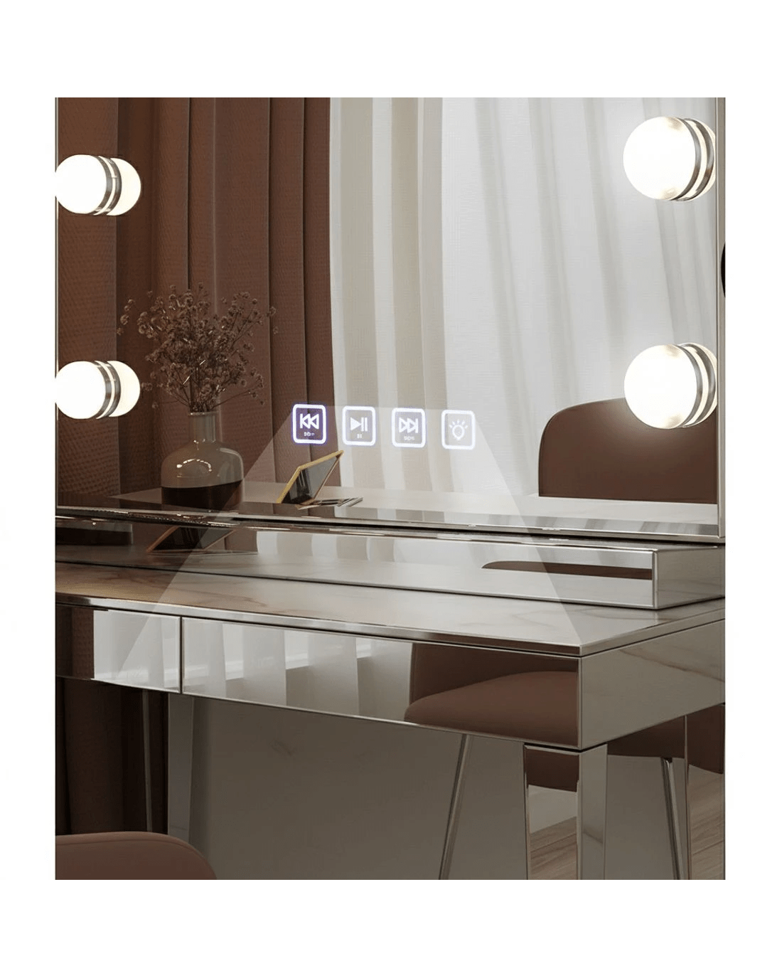 Get the star treatment with our gorgeous Embellir Make-up Mirror. Framed with 15 LED bulbs, this mirror really lights up your visage through your daily makeup regimen. The aluminium frame is sturdy, lightweight, and adds a touch of glamour to the entire mirror. The frame sits on an equally smooth powder-coated MDF base for stability and durability. Best of all, the built in Bluetooth speaker allows you to listen to your favourite audiobooks, music and podcasts as you go. Even more wonderful is that the LED light can be easily adjusted for brightness and colour temperature using our intelligent touch controls. Turn your bedroom or bathroom into a celebrity set overnight with our Embiller Make-up Mirror, and enjoy beauty in all its illuminated brilliance.