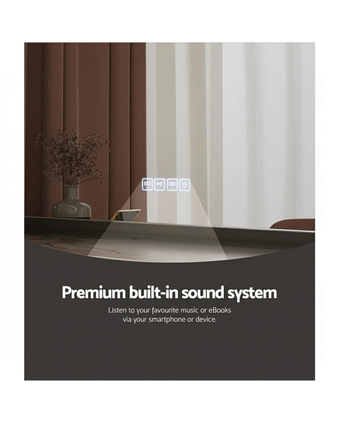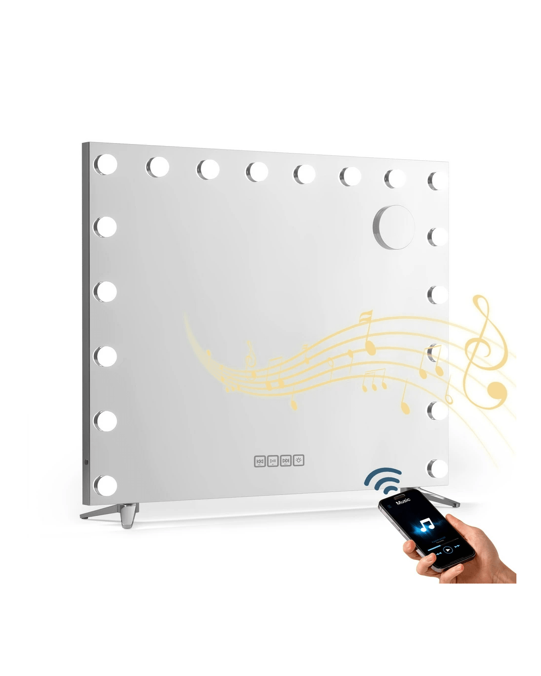 Get the star treatment with our gorgeous Embellir Make-up Mirror. Framed with 18 LED bulbs, this mirror really lights up your visage for your daily makeup regimen. The metal frame is sturdy, lightweight, and adds a glistening touch of glamour to the entire mirror. The frame sits on an equally smooth powder coated MDF base for stability and durability.Best of all, the built in Bluetooth speaker allows you to listen to your favourite audiobooks, music and podcasts as you go. Even more wonderful is that the LED light can be easily adjusted for brightness and colour temperature using touch controls: choose from cool white, daylight and warm yellow. Turn your bedroom or bathroom into a celebrity VIP set overnight with our make-up mirror, and enjoy beauty in all its illuminated brilliance.