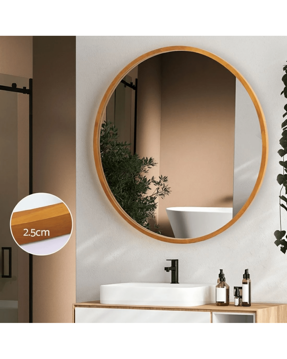 Elevate your home's ambiance with this stunning Embellir round wall mirror. Crafted with a beautiful wooden frame and boasting a premium 2.5cm thick mirror, it delivers exceptional clarity and reflects the quality of its construction. The exquisite details showcase the mirror's masterful craftsmanship, adding a touch of elegance to any space. Easy installation allows you to create a focal point in your living room, bedroom, hallway, or bathroom in no time.