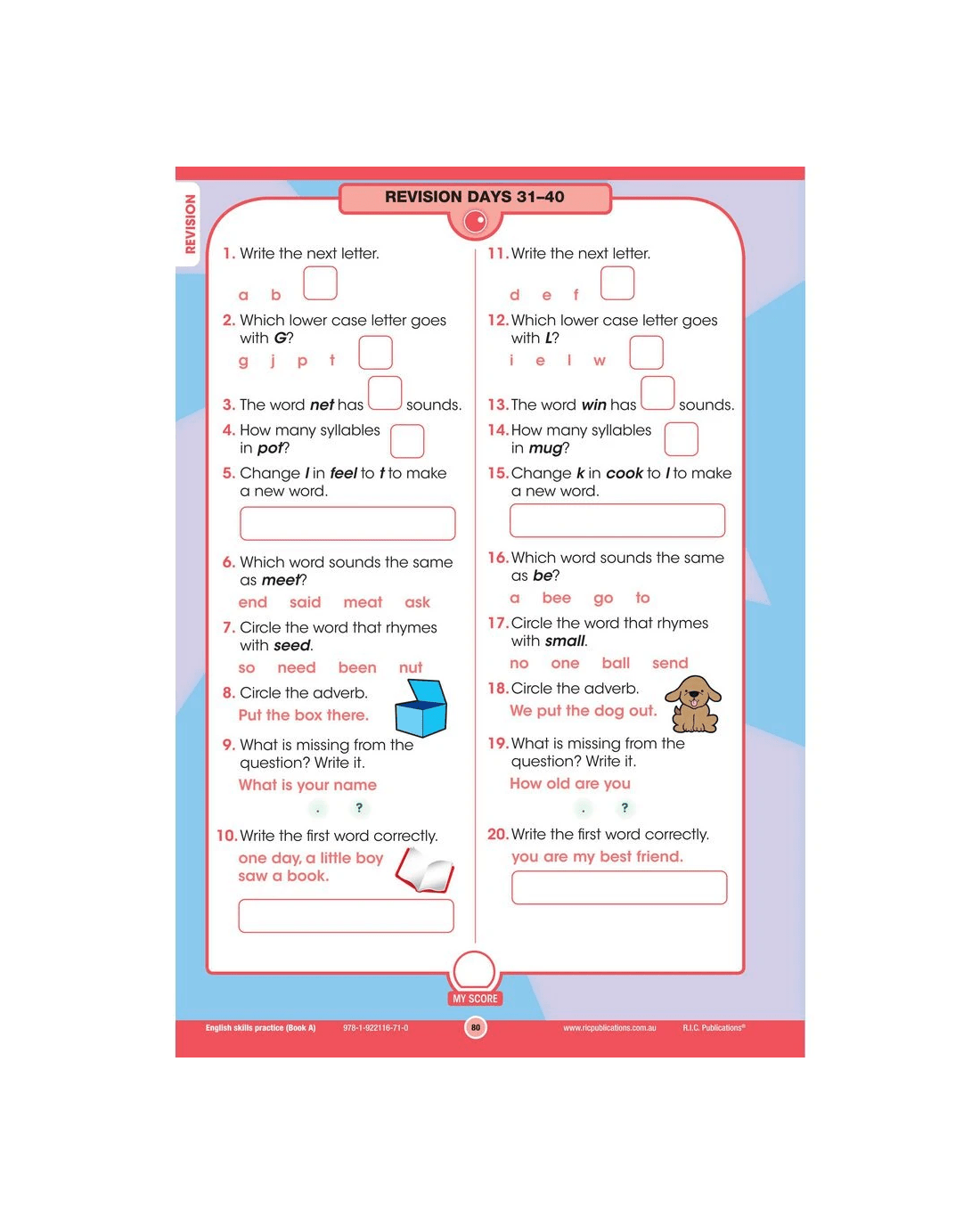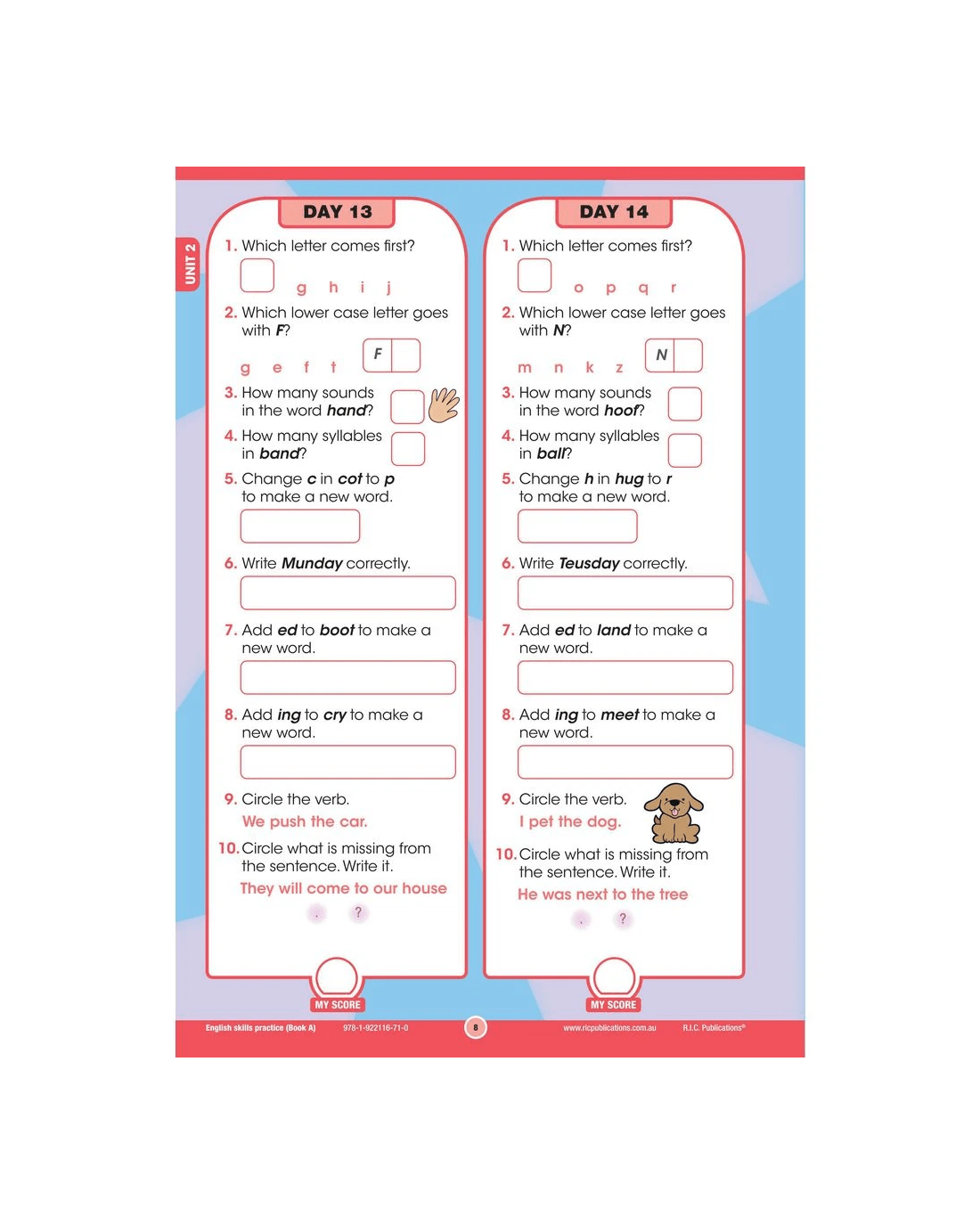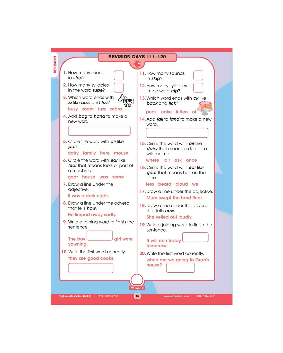 The English Skills Practice Workbook A boasts fun and colourfully illustrated daily exercises that will help you practice your English skills. Covering areas of the Australian Curriculum, every set of quick but challenging questions is designed to effectively consolidate students’ learning and reinforce concepts taught. With 150 days of questions in the workbook, organised into 15 units of 10 days followed by a set of revision questions for each unit, this resource has you covered.
