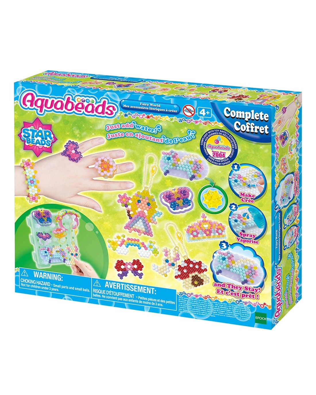Design fashionable, wearable art with Aquabeads Fairy World Complete Set! Set includes over 800 solid, jewel and star shaped beads in a variety of vibrant colors, along with templates, layout tray, sprayer and jewelry bases to design wearable creations! Create your fairytale wardrobe by following the templates to create bead designs, and once they dry, fasten them to the included ring, barrette and bracelet bases. When you're ready for a change, swap out the designs by creating new designs for your fashionable accessories! Use the included creation base as a way to organize and display your jewelry and bead designs. Ages: 4+