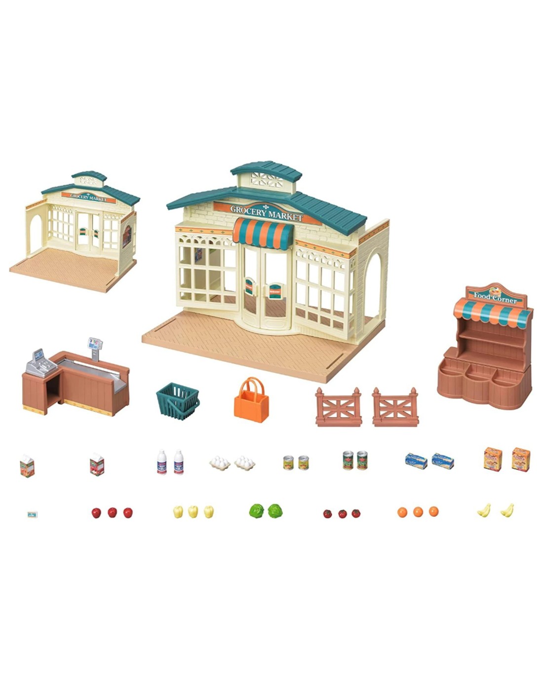 The Grocery Market features a checkout counter and shelving and comes with plenty of ingredients. A shopping basket is also included, allowing for more fun while shopping. The ingredients on top of the counter can be moved into the bag by sliding the bar on the cash register and the walls and flooring of the shop can be detached. The Sylvanian Families live in the idyllic world of Sylvania and encourage traditional family life play incorporating houses, furniture, accessories and memorable characters all with incredible detail that you'll love. Note: Figures not included Ages: 3 +