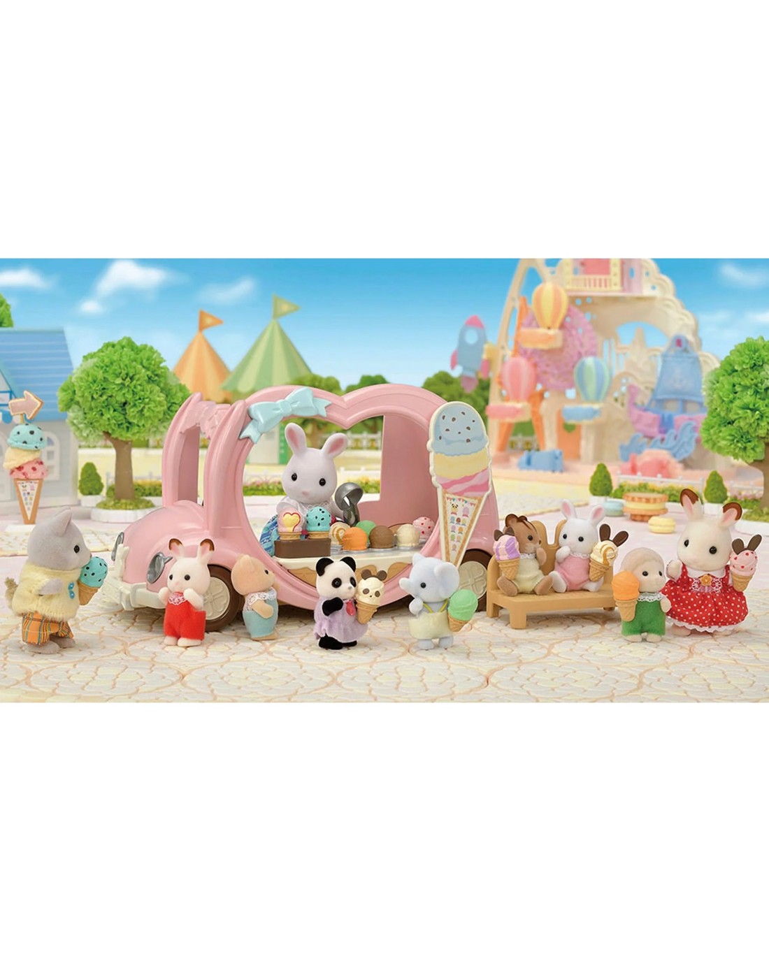 The Ice Cream Van set contains over 30 colourful and deliciousSylvanian Familieslooking ice creams and accessories. The ice cream van has a pastel pink colour and a charming rabbit design. Serve the ice cream scoops in the cones and add chocolate toppings. The chocolate toppings are in the shape of adorable animal ears! The toppings come in different shapes, so you can make rabbit, cat, or pandaSylvanian Familiesthemed ice creams! The ice cream cones can be held by the figures. The driver's seat can be removed and used as a bench. The display case can be flipped around and used as a seat! The van can also be used as a fourSylvanian Familiesseater vehicle. Remove the display case to tidy the accessories away underneath. Combine with the Baby Amusement Park, Popcorn Delivery Trike, Baby Windmill Park or Baby Balloon Playhouse (all sold separately) for a full theme park play experience! Ages: 3+