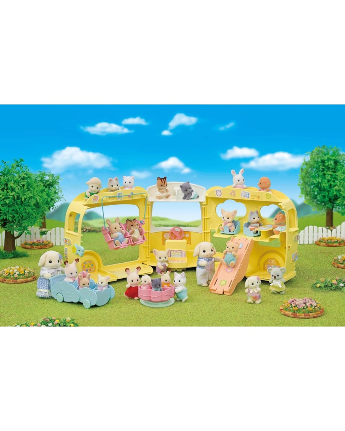 The Rainbow Fun Nursery Bus is a triple-decker nursery bus that seats 28 babies, including cradled babies (figures not included). The bus folds out into a fun play area for the babies. The seats turn into a merry-go-round, swing, slide, see-saw, piano and baby carriage. Any babies, including the cradled babies, can sit in the merry-go-round and baby carriage. The ropes of the swing can be used as seatbelts on the bus. The Sylvanian Families live in the idyllic world of Sylvania and encourage traditional family life play incorporating houses, furniture, accessories and memorable characters all with incredible detail that you'll love. Note: Figures are not included. Ages: 3 +