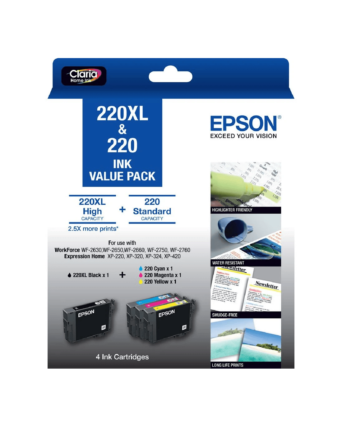 This Epson 220XL Ink Cartridge Value Pack contains all 4 colour cartridges so you can replace all your cartridges at once or simply stock up. It contains one black 220XL cartridge and 3 coloured 220 cartridges. The Black 220XL has an estimated page yield of 500 sheets and the standard 220 colour cartridges have an approximate yield of 165 pages