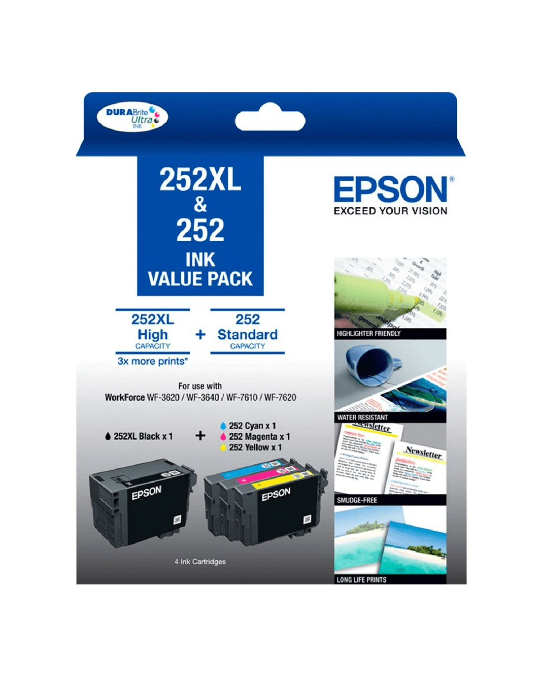 The Epson 252XL black and 252 coloured ink cartridges are specially formulated for use with your compatible Epson printer to deliver professional quality prints which resist fading and smudging. Each cartridge contains DURABrite Ultra ink, which is a 4 colour pigment based ink technology that delivers brilliant, ultra-sharp detail on plain and specialty papers.