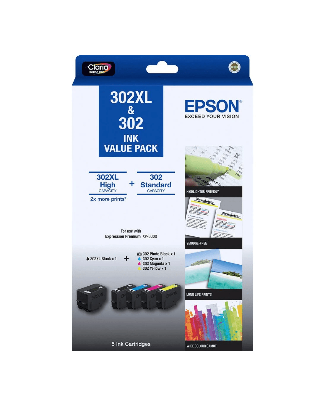 This Epson Value Pack includes 4 standard ink cartridges and 1 black 302XL cartridge for higher volume printing applications. The Claria dye ink has been especially designed for photo printing and results in high definition, glossy and brightly coloured images.