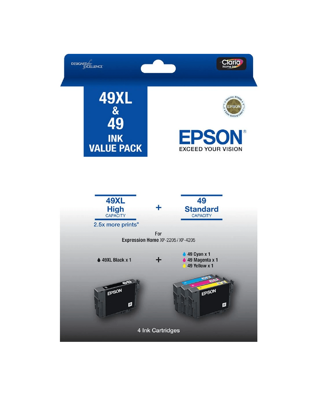These Epson 49 Ink Cartridges are designed to deliver crisp, clear text documents and glossy, lab-quality photos. Ideal for affordable, reliable printing without compromise. This value pack, containing a high yield black ink cartridge as well as cyan, magenta and yellow cartridges, is compatible with Epson XP-2205 and XP-4205 Ink-Jet printers.