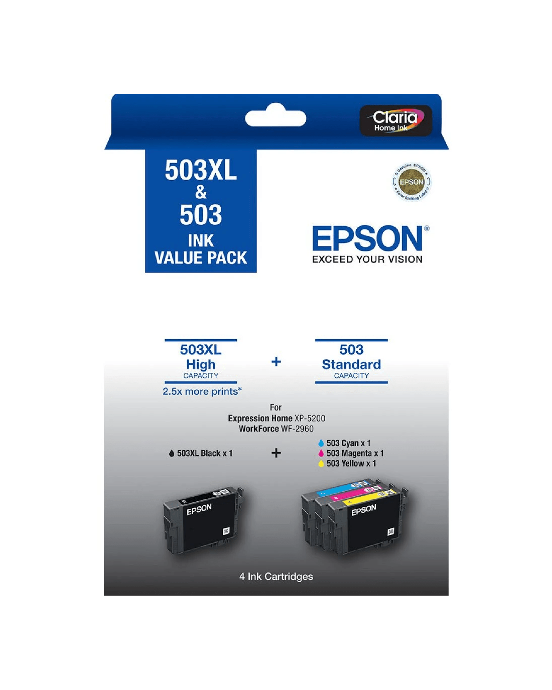 These Epson 503 ink cartridges are designed to deliver crisp, clear text documents and glossy, lab-quality photos. Ideal for affordable, reliable printing without compromise. This value pack, containing black, cyan, magenta and yellow cartridges, is compatible with Epson XP-5200 and WF-2960 Ink-Jet printers.