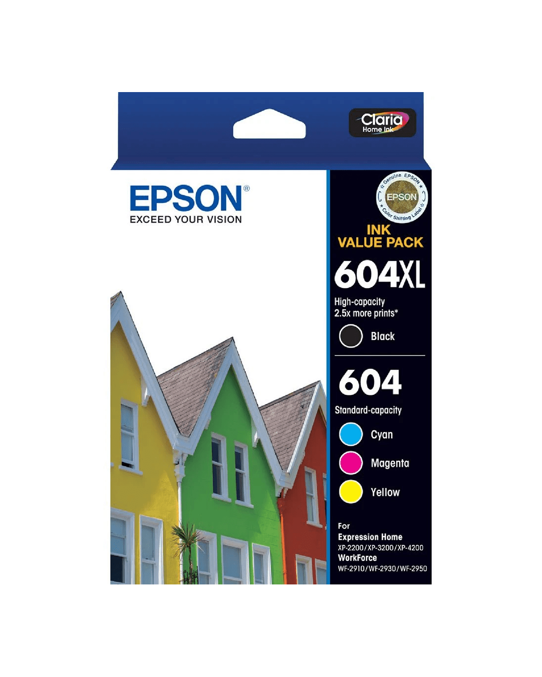 These Epson 604 ink cartridges are designed to deliver crisp, clear text documents and glossy, lab-quality photos. Ideal for affordable, reliable printing without compromise. This value pack, containing a high yield black ink cartridge as well as cyan, magenta and yellow cartridges, is compatible with Epson XP-2200, XP-3200, XP-4200, WF-2910, WF-2930, and WF-2950 Ink-Jet printers.