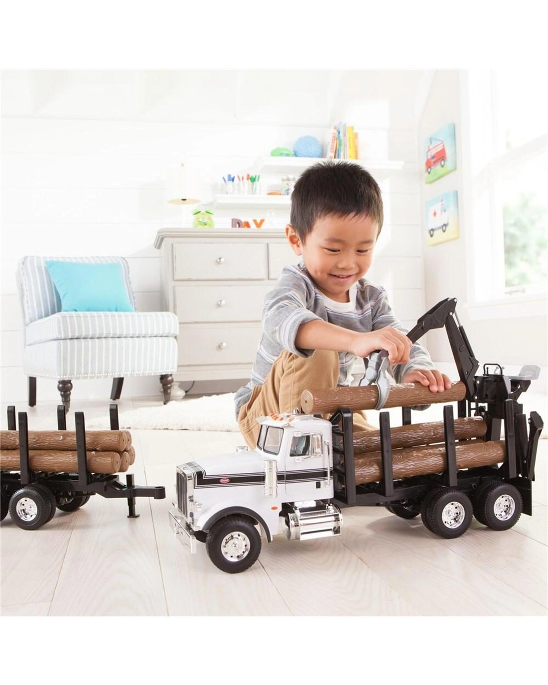 This exceptionally detailed 1:16 Peterbilt Model 367 features a logging set-up on the rear with a spring loaded grapple hook at the end of the movable crane boom arm with operator seat puts the child in the operator seat for loading and unloading of the logs. Stabilizers are available on the rear of the truck bed as well as a safety bar at the rear of the cab. The detachable pup trailer is available for those extra logs that need to be delivered. Ten logs are included with this set. The Peterbilt cab features lights and sounds, opening doors and adjustable mirrors. A lot of play value in this great item.