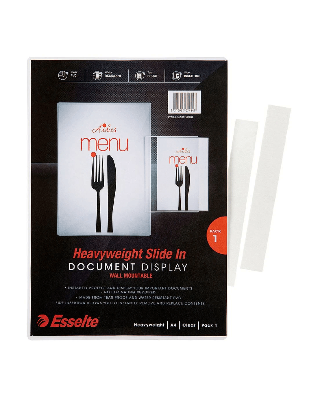 The Esselte Document Holder can be used to display instructions, a menu, illustrated posters and other A4 sized documents. Simply insert your paper via the side and change it as frequently as you need. It has a water resistant and tear proof design to be long lasting and durable.