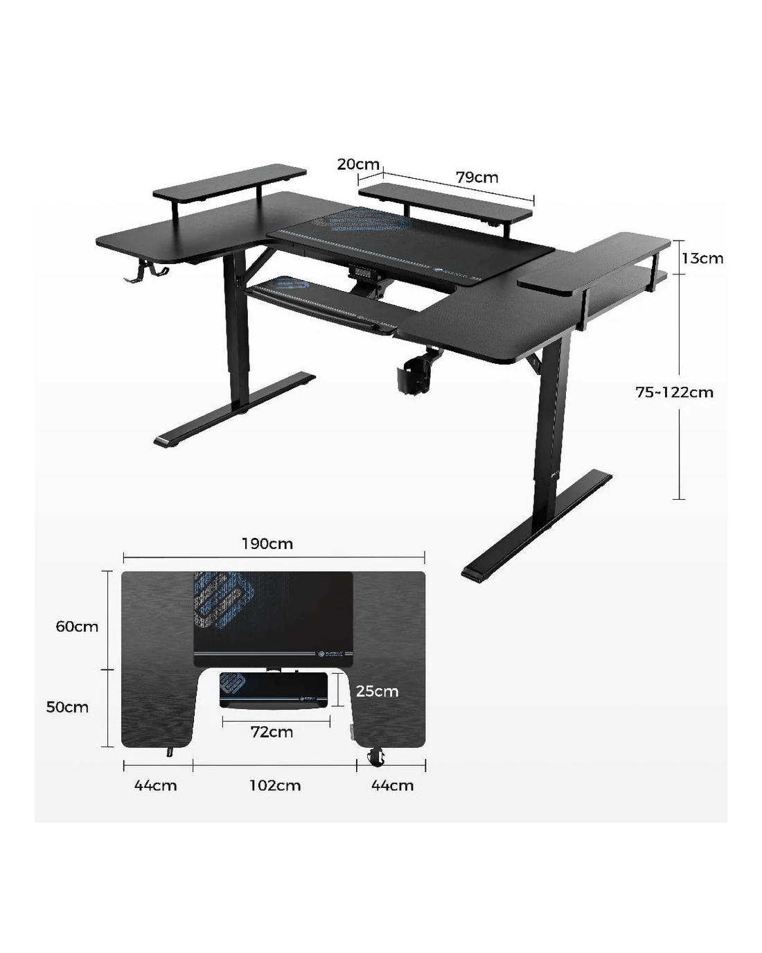 - It has a large 1900 x 874 mm gaming desk area with space to accommodate your music, studio, gaming or live streaming equipment while leaving you room to move.