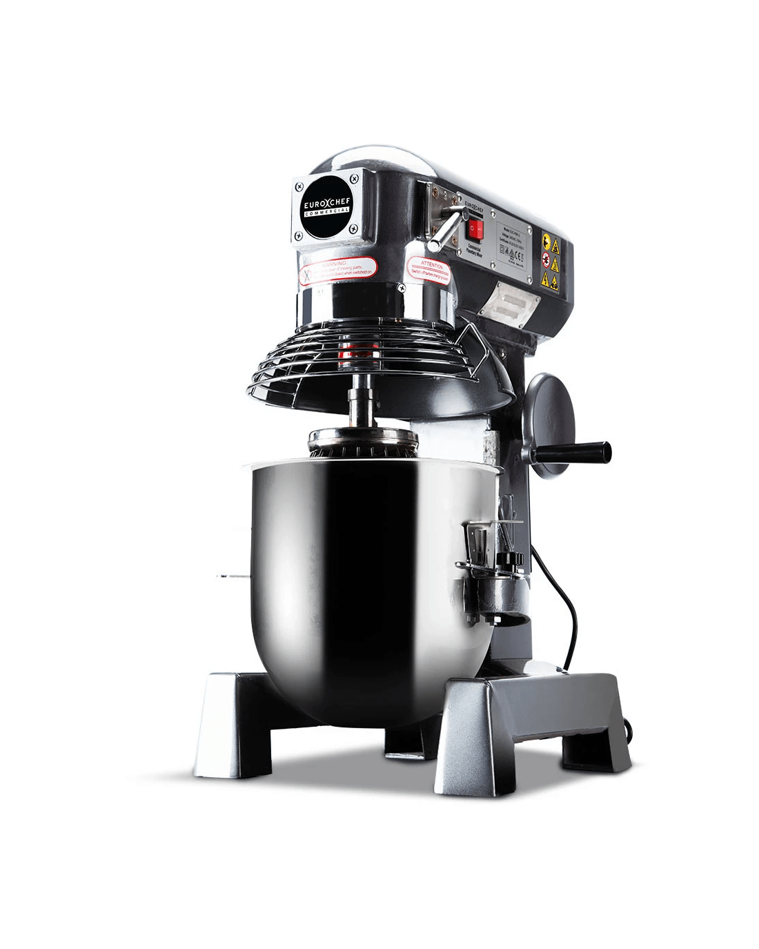 The bowl, wire whisk, spiral dough hook and flat beater can each be conveniently attached and removed easily in seconds. These stainless steel attachments along with the bowl exceed food industry standards worldwide. A full metal body design offers both stability and effortless cleaning, while the protective guard provides peace of mind. The EuroChef Commercial range is offered direct to the public at wholesale prices, making this stand mixer a smart investment for savvy owners of restaurants, pizzerias and school canteens.