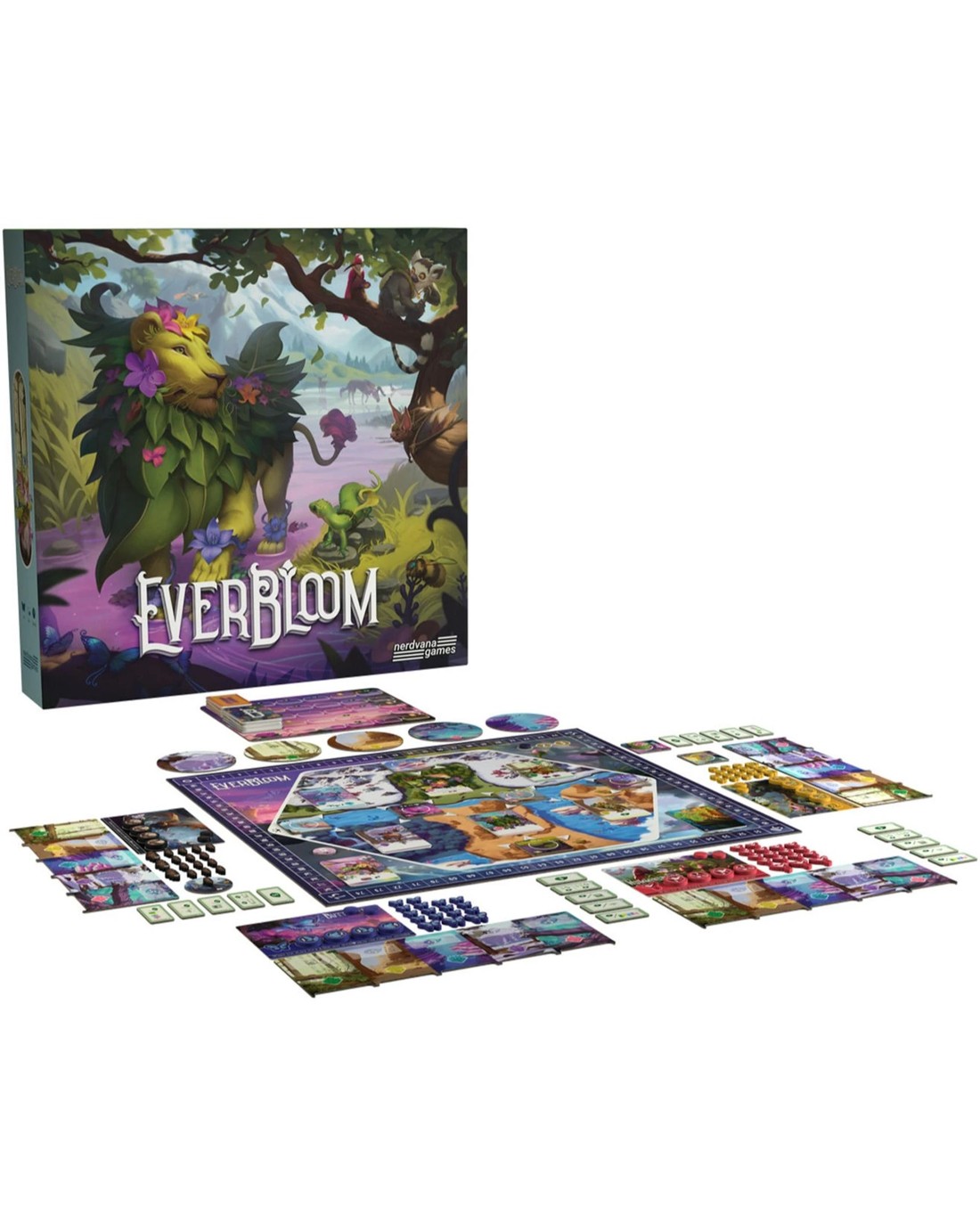 A game of pollinators guiding hybrid beings to return life to the wilderness. As the final flower unfurled its petal and the pollinating factions surged forth into every biome, the plight awakened Anteri, the legendary dragon of abundance. She begins her journey across the lands, bestowing her petals upon chosen creatures in every biome, transforming them into wondrous hybrids of flora and fauna. Recognizing the potential for rejuvenation, pollinators from every corner of the world converge on these hybrid beings to attract them to their respective habitats. The Everbloom has begun again. In Everbloom, lead one to four pollinating factions: Bats, Bees, Butterflies, Hummingbirds, Lemurs, and Lizards to create an abundant habitat full of hybrid beings. Each round you'll send pollinators from your faction into the wilderness to landmarks in the hopes of attract hybrid beings to your habitat, eventually pollinating their flora in exchange for nectar and points. Along the way, you'll complete blooms and gather nectar cards to make sure your habitat flourishes. After the final round, you will gain points for the nectar you've collected in each biome as well as your progress on the bloom track, the faction with the most points wins! Ages: 13 + | Players: 1 - 4 | Playtime: 60 - 90 min