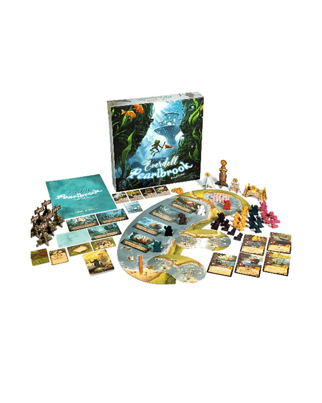 Explore a new underwater society underneath the Pearlbrook River! Pearlbrook introduces a new side board, the River board, where you'll send your Frog Ambassador to gather a new resource, pearls. You'll also encounter new aquatic critters and constructions! Collect enough pearls and you can construct fabulous Wonders and Adornments, to make your city the pride of Everdell! Ages: 10 + | Players: 1 - 4