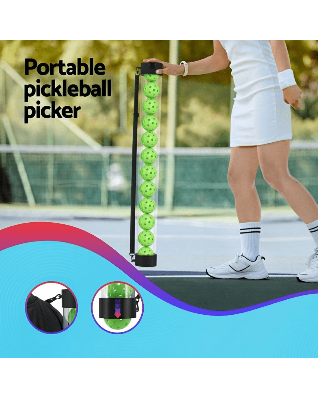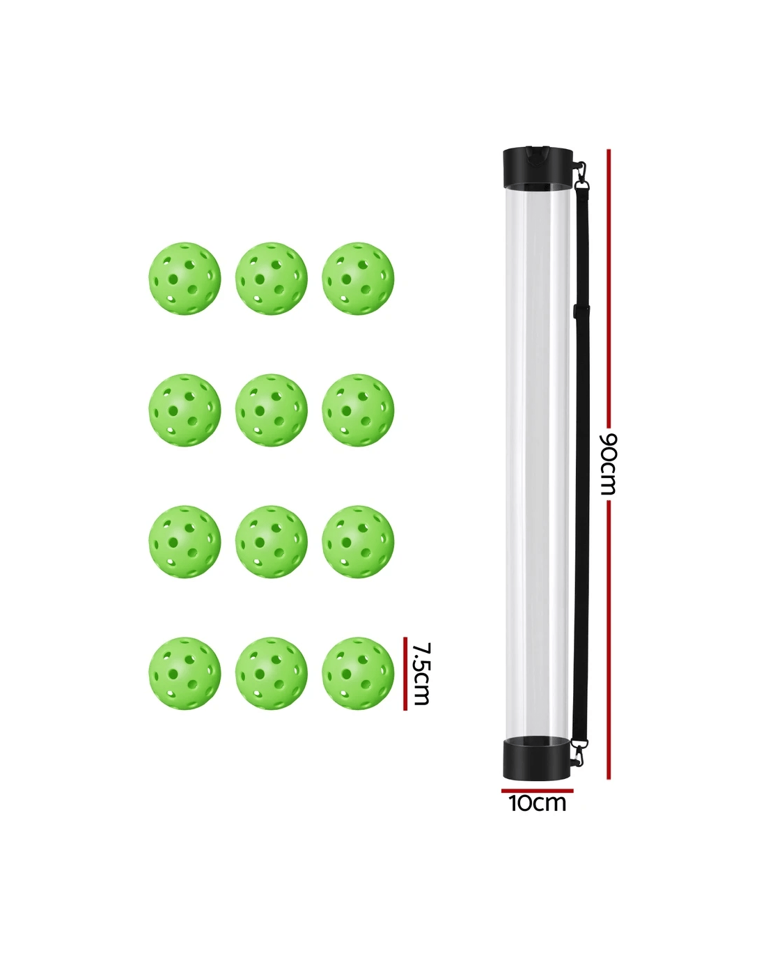 The Everfit 12PC Pickleball Collector Set simplifies ball collection for pickleball, tennis, baseball, and paddle sports. Its transparent hopper allows quick visual checks, while the adjustable shoulder strap ensures comfortable carrying during practice or matches. Built with a lightweight yet durable 90cm frame, this retriever enables one-handed pickup on courts or fields. The set includes 12 pickleballs and a space-saving design ideal for coaches, players, or families. No assembly needed – just grab, collect, and play!