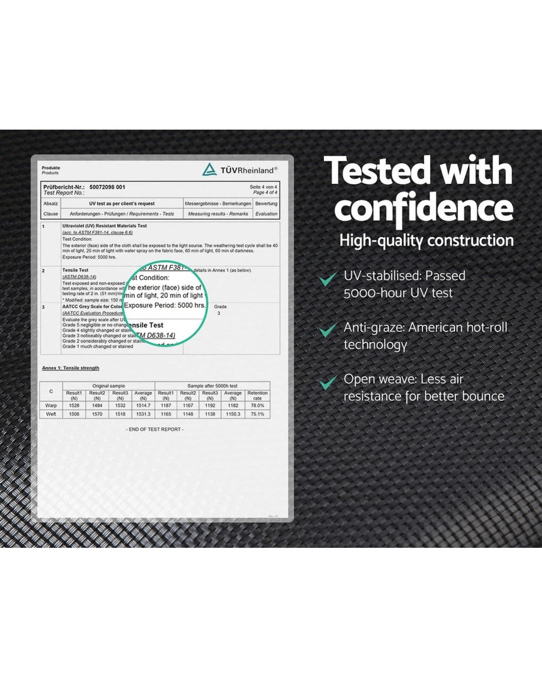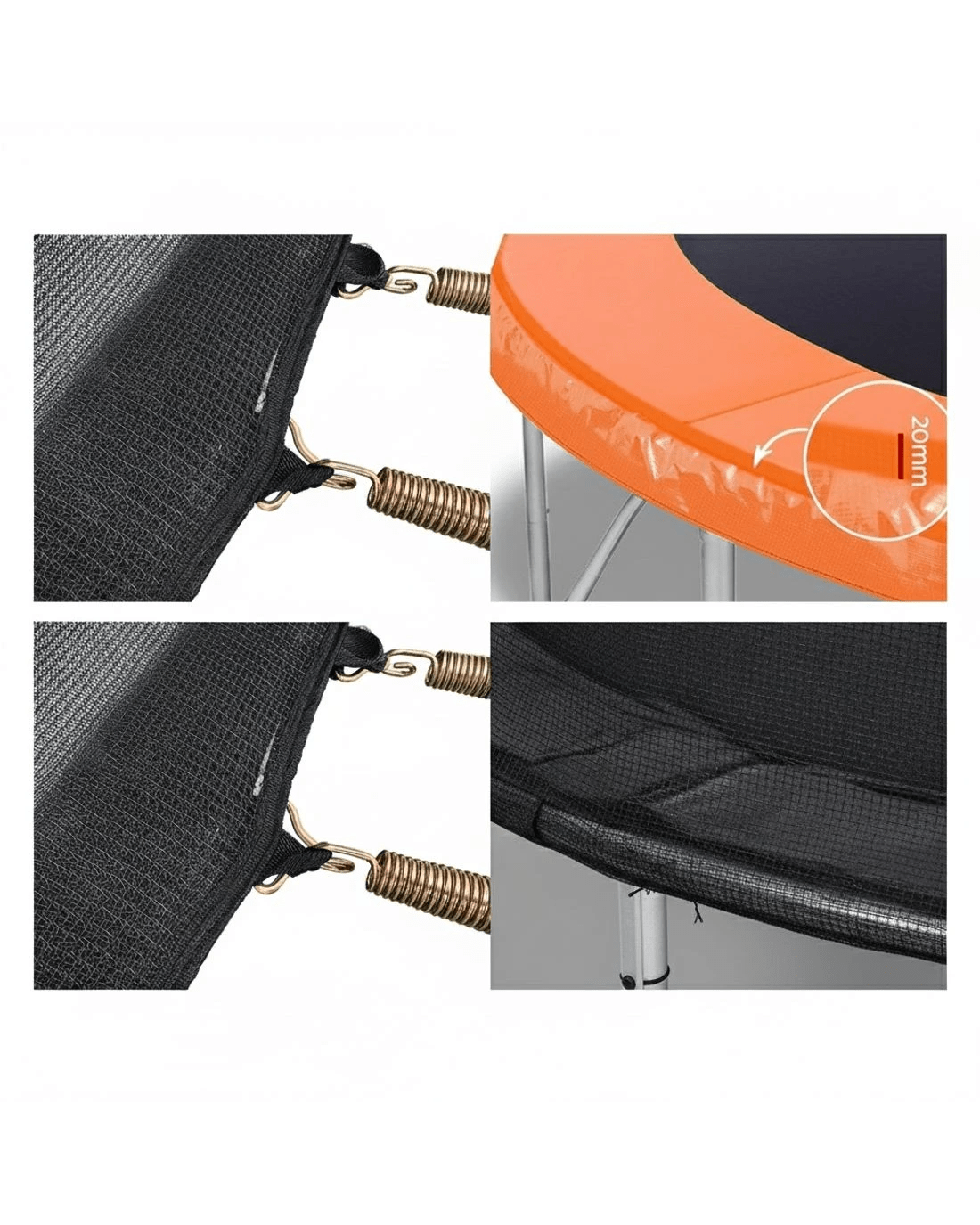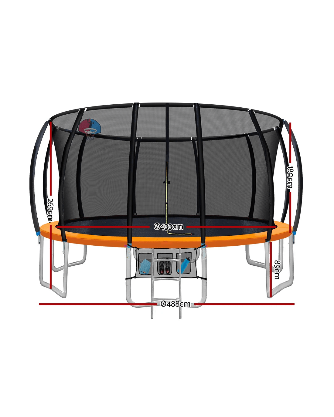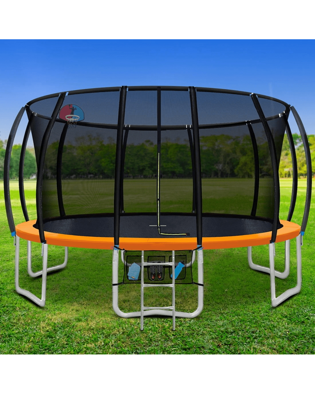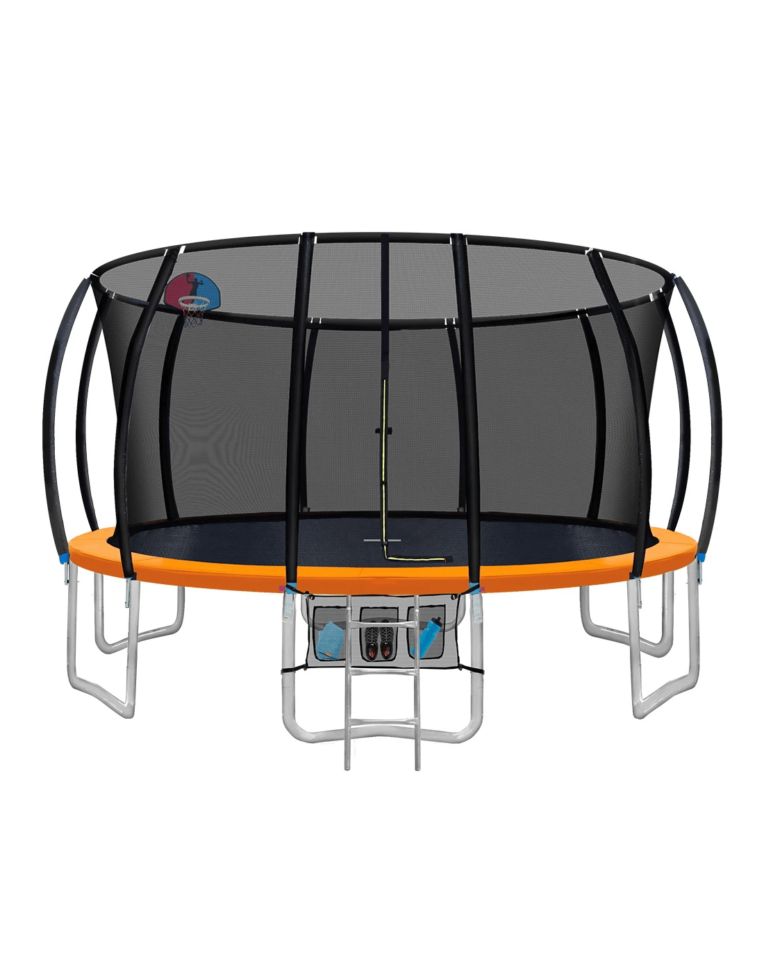 Bounce to your heart's content with the Everfit Trampoline. With its superior bounce characteristics featuring 108-piece triple rate springs, the 16-foot Trampoline enables safe and durable bouncing with no worries. The heavy-gauge steel framework is designed to handle all robust play and is UV-tested for quality and reliability. Other great features include a curve design for more rigidness, 20mm thick padding, anti-graze mat, safety netting and a double-lock zip-and-clip entry. Not least, the included basketball hoop, basketball and pump really adds an awesome fun factor to the entire ensemble.