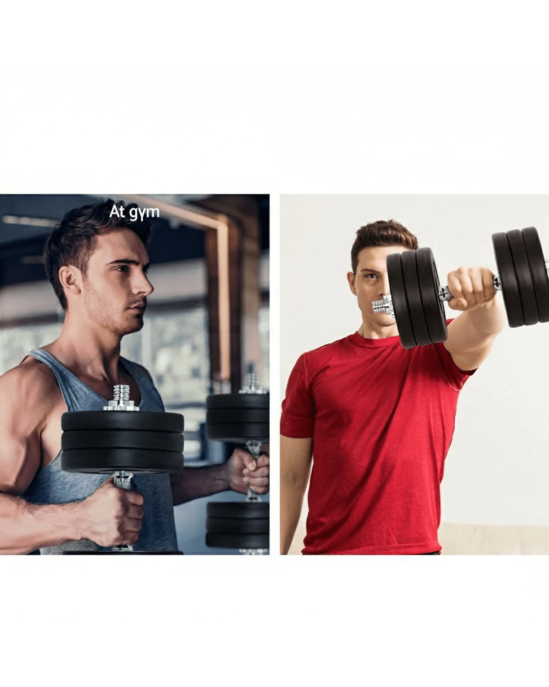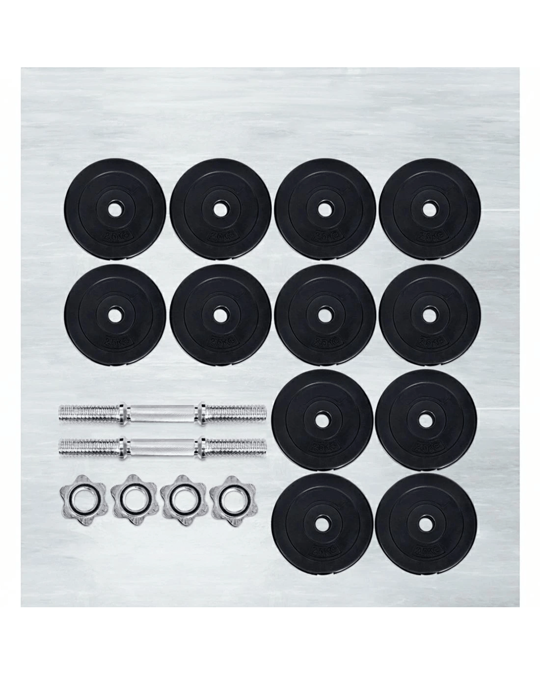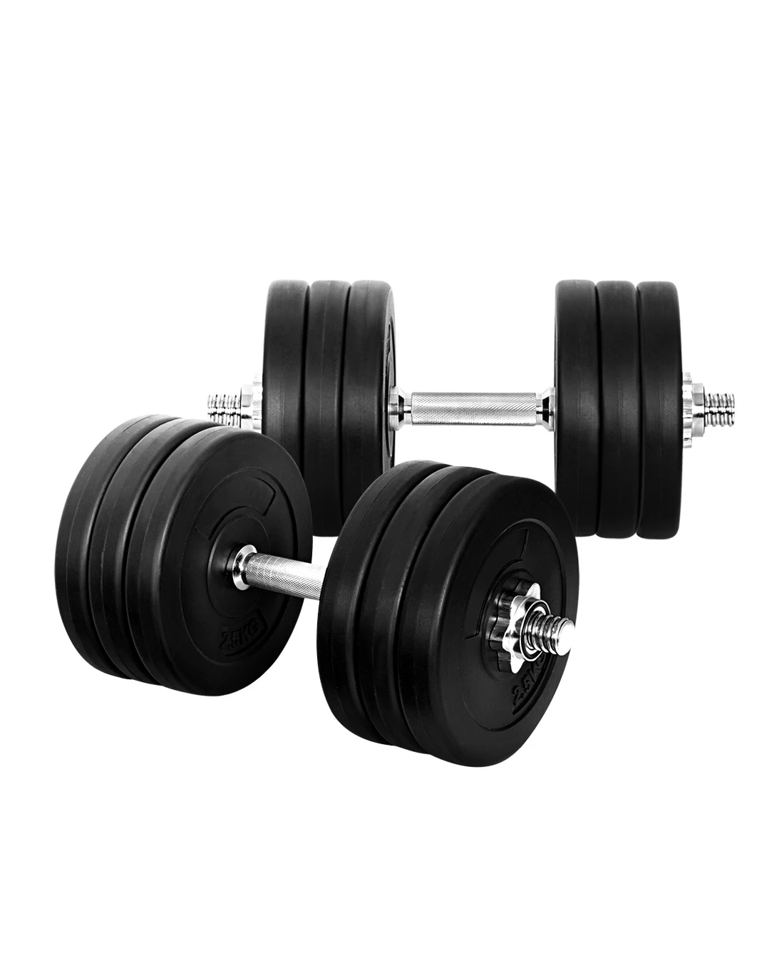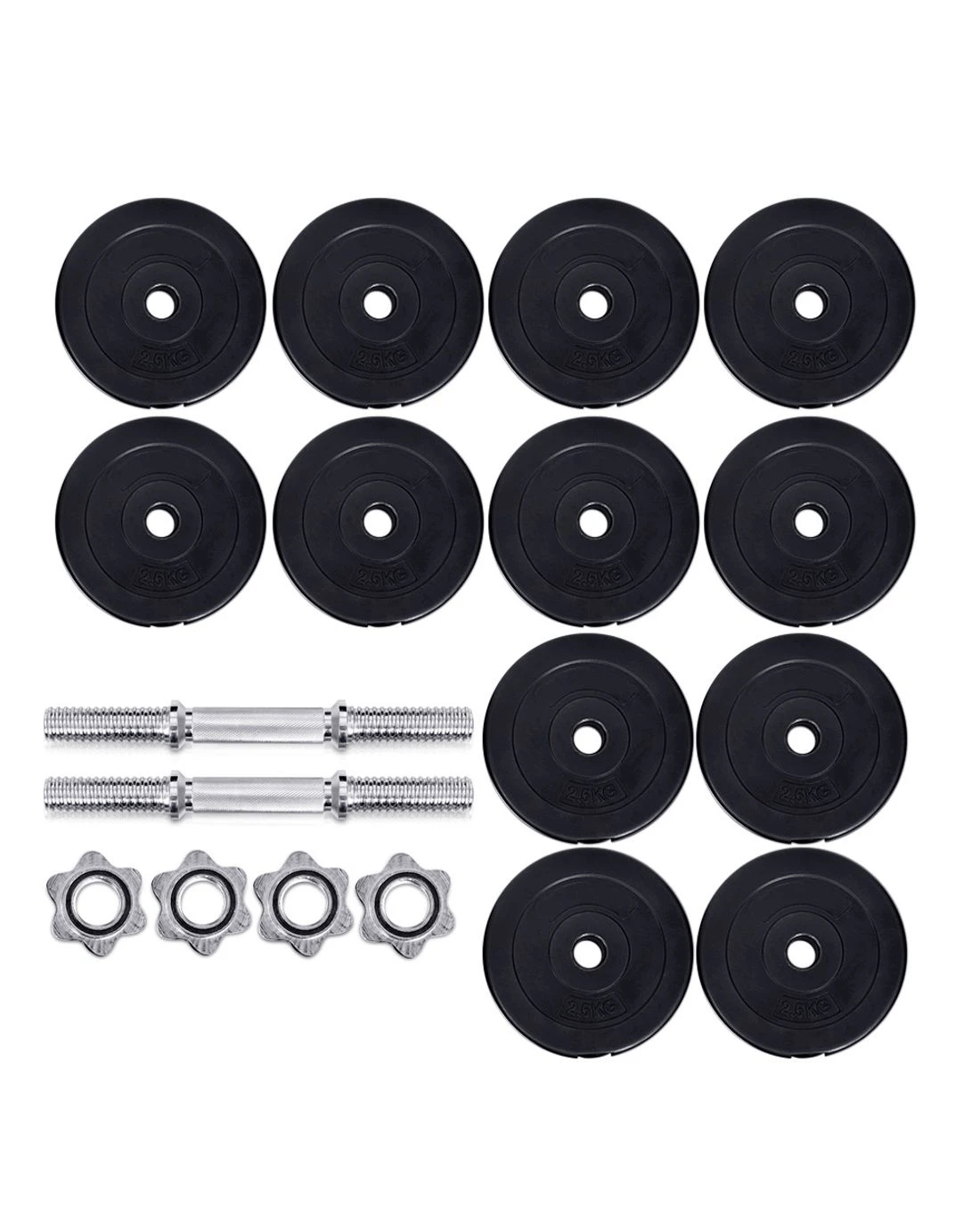 Time to get tough. If you are looking to boost those triceps, biceps and shoulders, our 35kg Dumbbell Set is the perfect deal for you. Whatever your game is, our dumbbell set lets you strengthen and tone those muscles your way. This commercial-grade set features a high-quality bar with non-slip handle that offers optimal gripping surface. Each weight plate weighs 2.5kg and is made of cast cement coated with smooth plastic, reducing clanging sounds and making them more floor-friendly. You can adjust the weight of the dumbbell by removing the weight plate and only using the dumbbell bar (weighing 2.5kg each) or adding more compatible weight plates. The star-shaped nuts ensure the weight plates stay securely in place for safe workouts. Best of all, the dumbbell comes in a set of two (two 17.5kg dumbbells for 35kg total) so that you can exercise both arms at the same time. Gym junkie or workout pro, you can get fit easily with our 35kg Dumbbell Set.