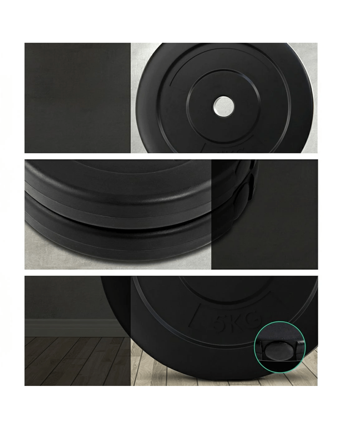Made of strong materials, these Home Gym Weight Plates will allow you strengthen and tone your muscles at home with ease. These weight plates are filled with sand and covered with robust, floor-friendly rubber to minimize noise and floor damage. Easily add and remove plates to ensure an appropriate workout for your specific muscles. Plus, the included solid chrome plated steel Barbell Bar, holds up to 150kg and is compatible with most standard 31mm - 35mm hole weight plates, so you can work at any weight. Choose from the fitness range that is both good for your body and good for your wallet.