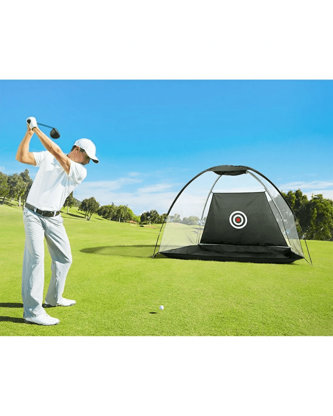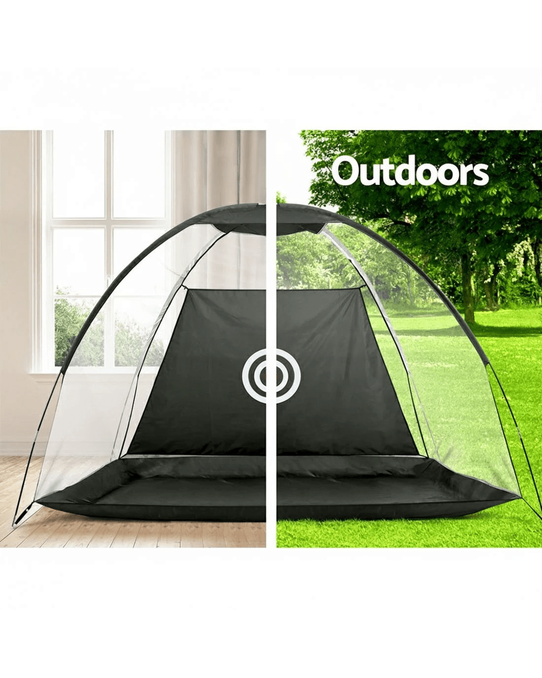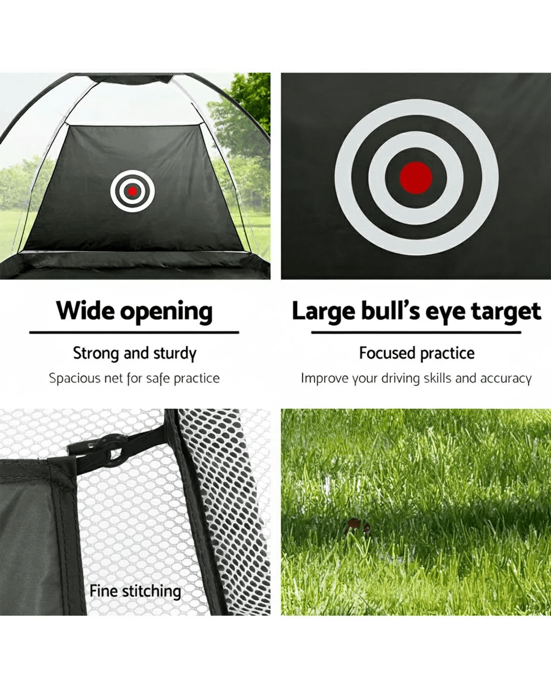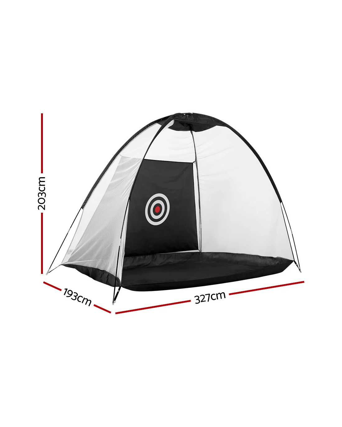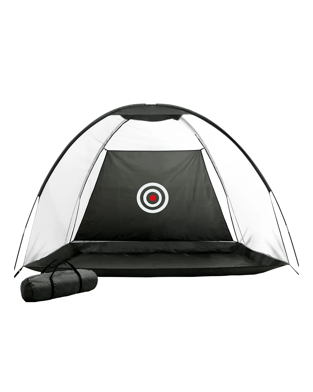 Looking to improve your game? Practice your swing in the comfort of your own home with the Everfit Golf Practice Net. Lightweight and portable, you can install the golf net anywhere, whether you're practicing indoors or outdoors. Made from durable oxford mesh with a fibreglass frame, so you know it will withstand your daily training regime. Features a wide opening for easy ball capture, and a large bullseye target to help improve your accuracy. It is easy to set up and stands stable for the duration of your training. Includes additional stakes for more stability outdoors and a free carry bag for ultimate portability. Hit the green with confidence: improve your swing from anywhere, anytime, with the Everfit Golf Practice Net.