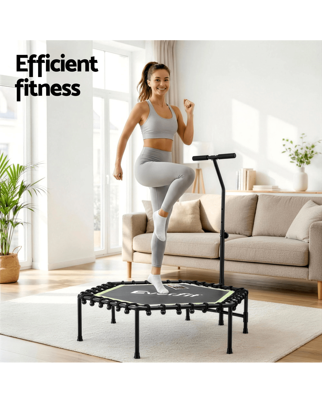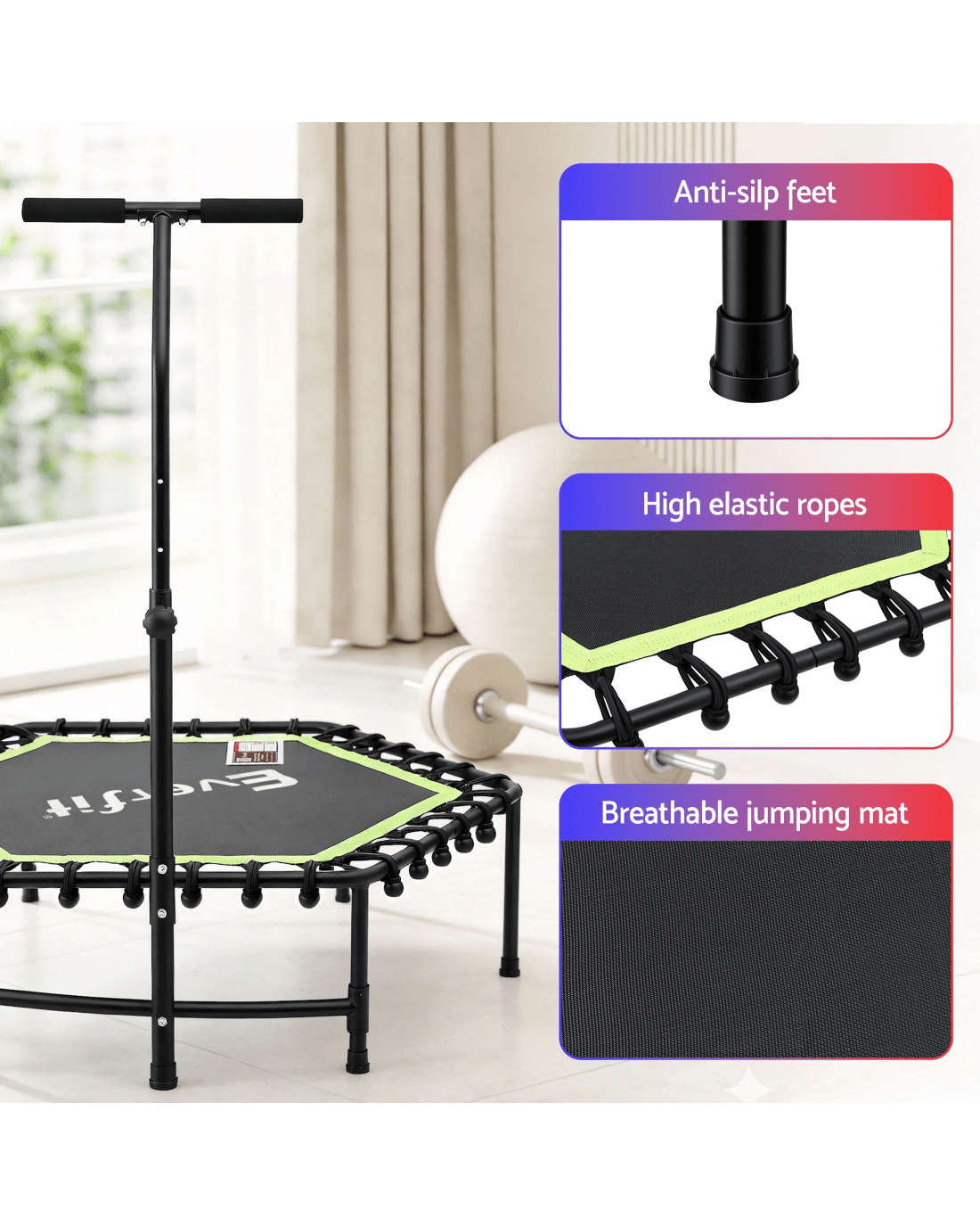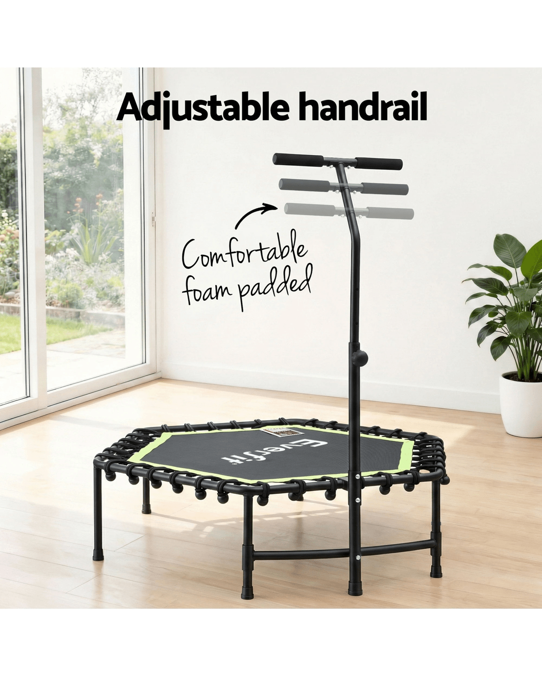 Our Everfit Fitness Trampoline is designed for peak performance and space efficiency. This model boasts a sturdy heavy-gauge steel frame and high-elasticity ropes, ensuring a superior bounce. The adjustable, foam-wrapped handrail and anti-slip feet guarantee safety and stability. Easy assembly and compact design make it an ideal addition to any workout space.