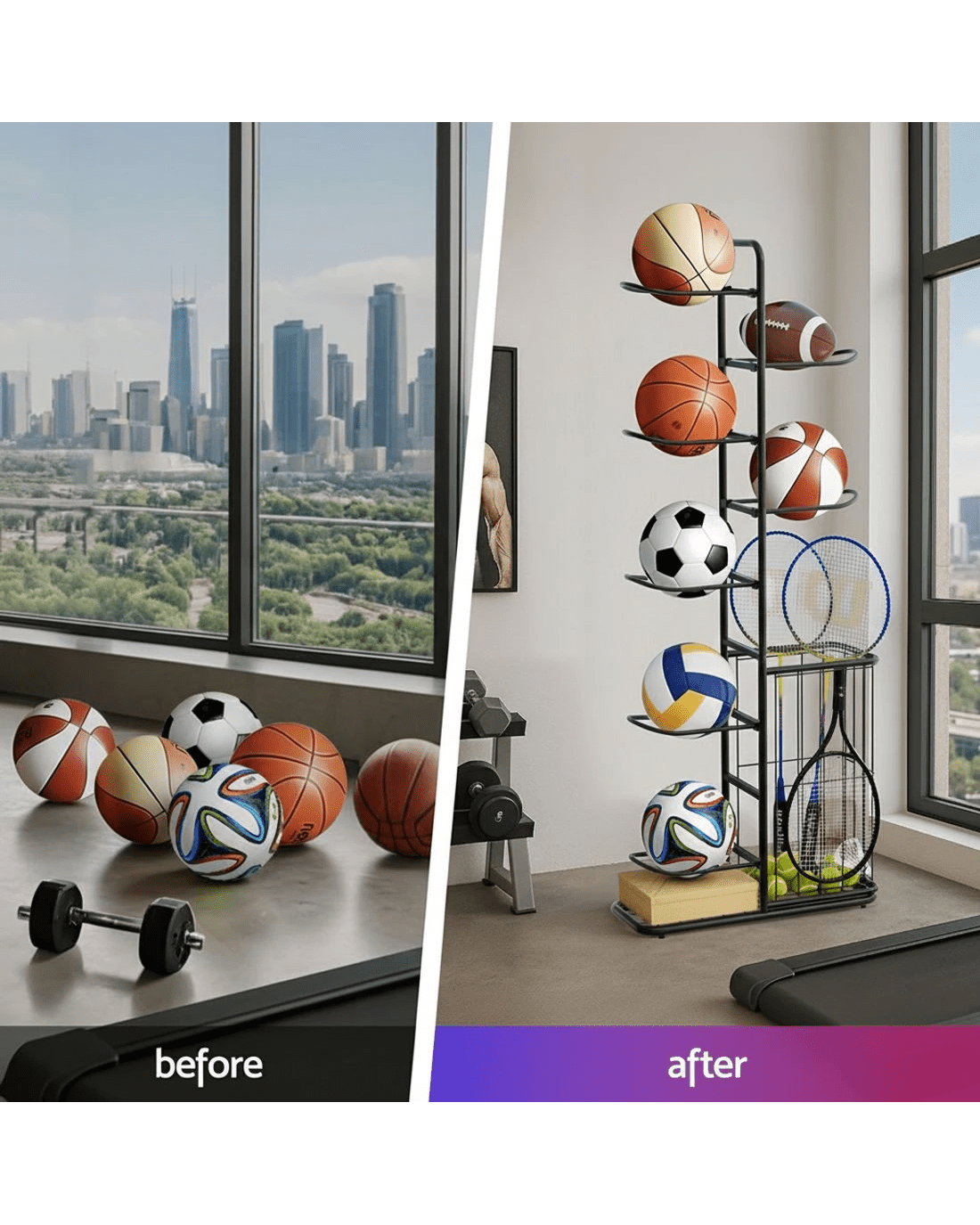 Tired of cluttered sports gear? The Everfit Ball Storage Rack is your Sports Equipment Organizer, designed for Aussie families, coaches, and fitness lovers. This Heavy Duty Ball storage rack basketballs, footballs, and volleyballs securely in its 7-tier rack, while the thoughtful side storage bin conveniently holds baseball bats, badminton rackets, or tennis rackets—keeping all equipment in one place. Perfect for garages, home gyms, or outdoor courts, it features easy assembly, steel frames for durability. Ventilated baskets prevent moisture buildup, and the compact footprint suits small spaces. Whether you're a parent managing kids' gear or a coach organizing team equipment, this Ball Storage for Indoor and Outdoor ensures everything stays tidy and accessible.