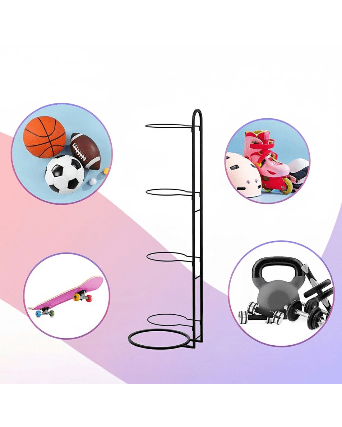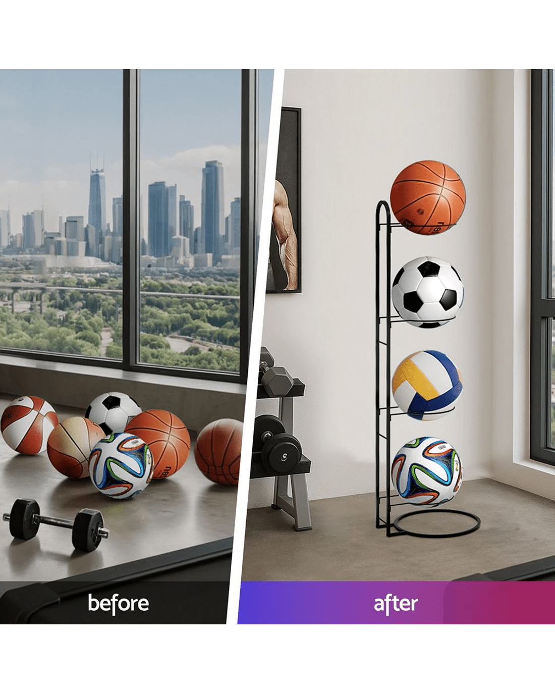Organize sports gear effortlessly with Everfit's 4-tier Ball Storage Rack. This heavy-duty Sports Equipment Organizer features sturdy steel frames, ideal for storing basketballs, footballs, or volleyballs in garages, gyms, or basements. The design ensures durability, while easy assembly saves time. Perfect as a space-saving Ball Holder for indoor/outdoor use.