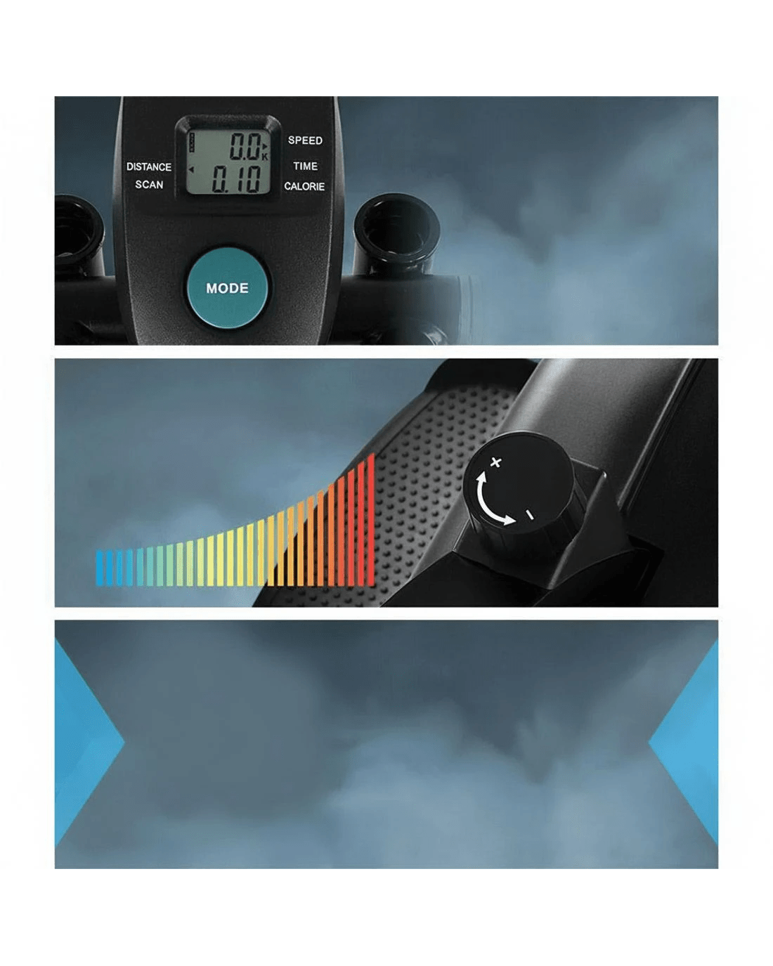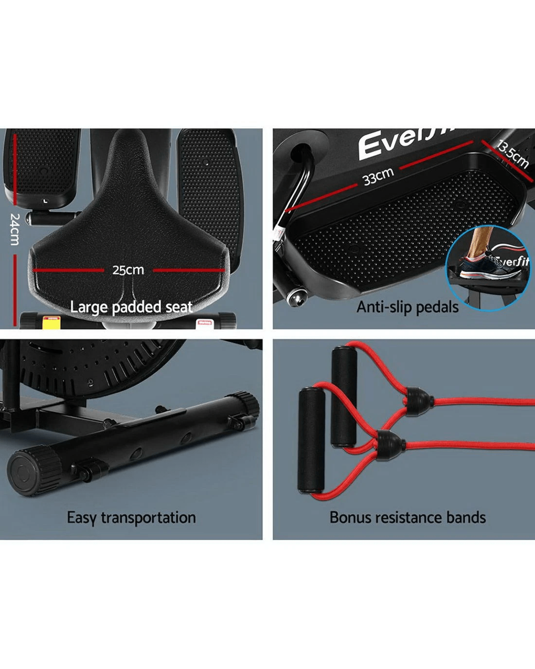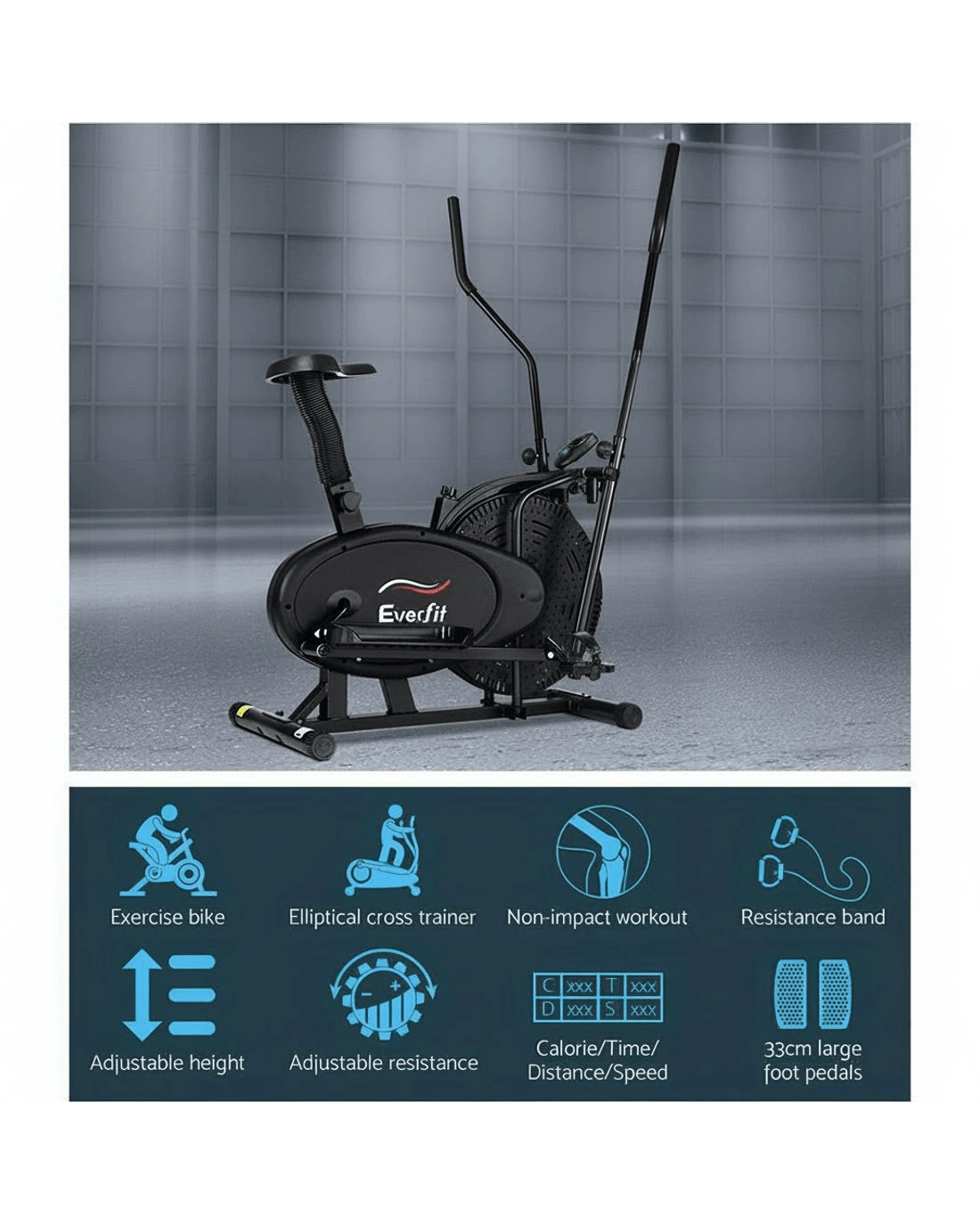 Elliptical cross trainers are excellent fitness machines for individuals who demand a training regime that works on all muscles and yet eliminates the risk of impact injuries such as treadmill running or walking. Hence the trainers are particularly helpful for those with joint problems with knees and feet. Our Everfit Elliptical Bike is a very efficient low-impact cross trainer that offers adjustable mechanical resistance to tone every muscle in your body. The easy-to-read LCD display lets you keep track of your training parameters. The industrial-strength powder-coated steel frame is strong and sturdy and the large seat is comfortable with every stride. Other great features include rubber-clad pole grips, reversible two-way movement, mode changes within 30 seconds and adjustable handlebar height and seat. Not least, the elliptical bike allows you to exercise whenever you want, anytime and anywhere.