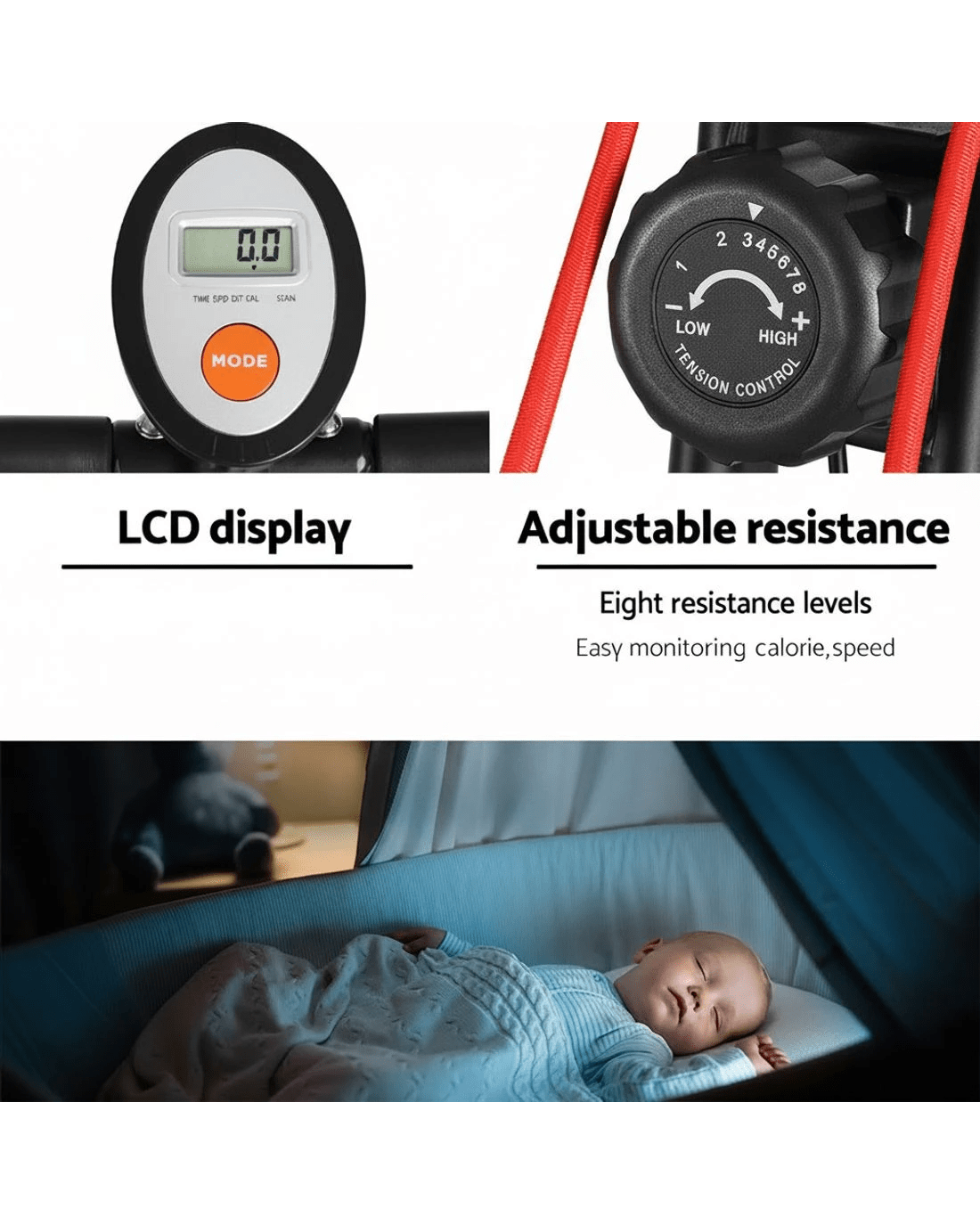 Looking for a compact and versatile exercise bike? Our Folding Exercise Bike features a sturdy steel X-frame and a silent magnetic resistance system, which offers eight resistance levels to provide a more challenging workout. The LCD monitor displays your progress during the workout, while the extra-wide comfortable seat and vertically adjustable seat can be adjusted to suit your preferences. With non-slip protective feet and a weight capacity of 100kg, this bike is durable and safe. Its foldable design also makes it easy to store and transport. The bonus resistance ropes add further variety to your exercise routine.