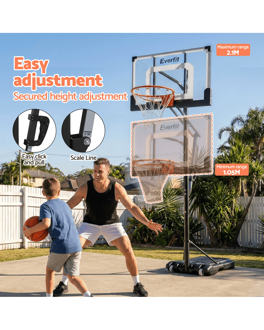 Make a splash this summer with the Everfit portable basketball hoop! This brilliant pool basketball hoop is a must-have for your backyard. It's an easily adjustable basketball hoop, featuring a heavy-duty steel frame and a convenient scale line to set the height anywhere from 1.05M to 2.1M. The base has handy built-in wheels for quick movement around the deck or patio. Its weather-resistant net and durable construction ensure this basketball hoop will provide hours of fun for the whole family.