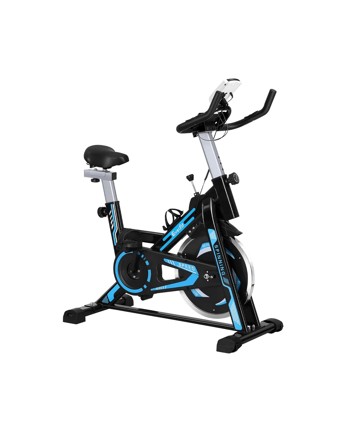 Unleash your fitness potential with our Everfit Spin Bike. It's engineered with a heavy flywheel for a smooth, realistic riding experience and variable resistance to challenge all fitness levels. The bike features a comfortable, adjustable seat and handlebars, and a digital monitor for tracking speed, time, calorie burn, and heart rate. Its compact size ensures easy storage. Perfect for high-intensity cardio, this bike brings the energy of a spin class right into your home.