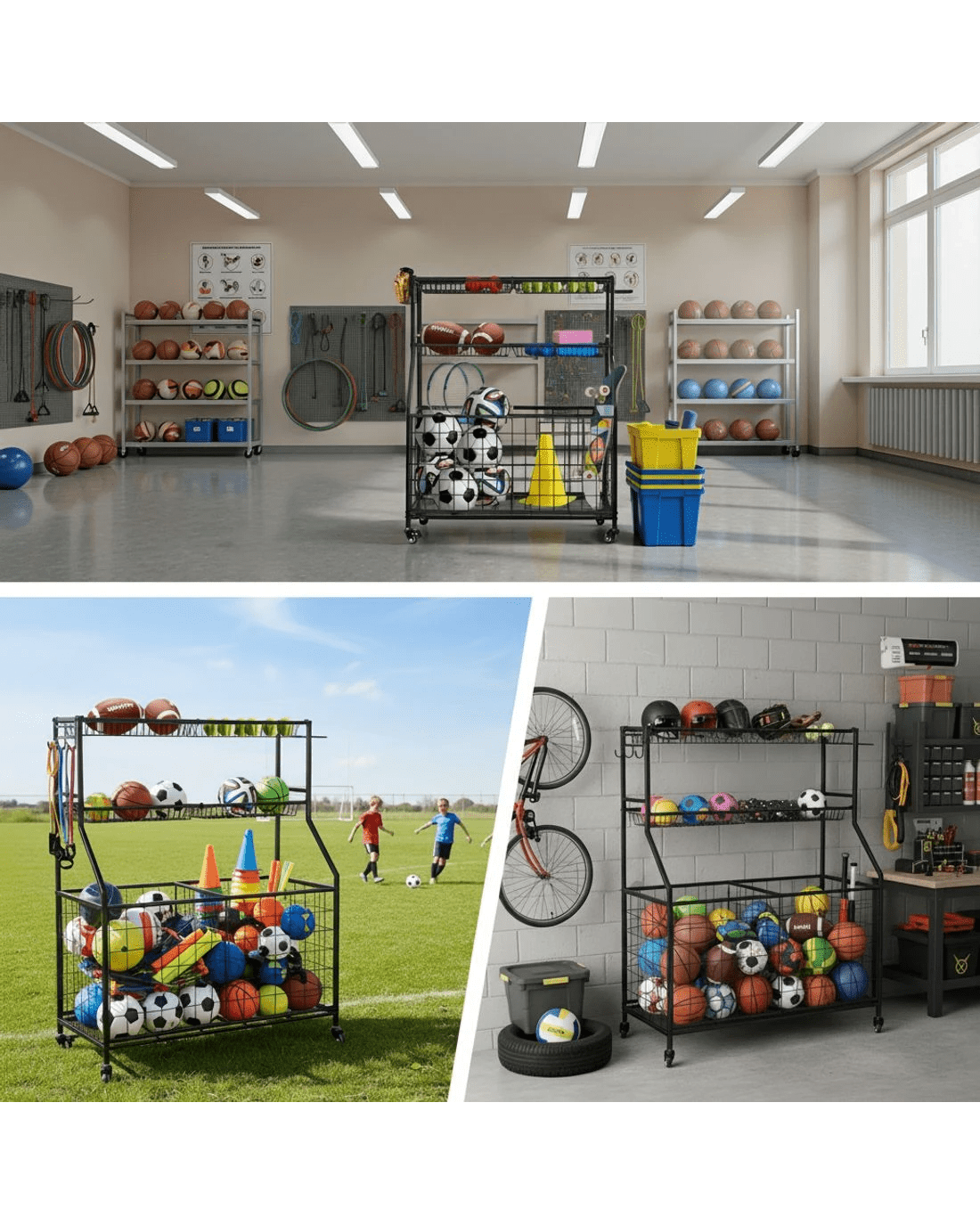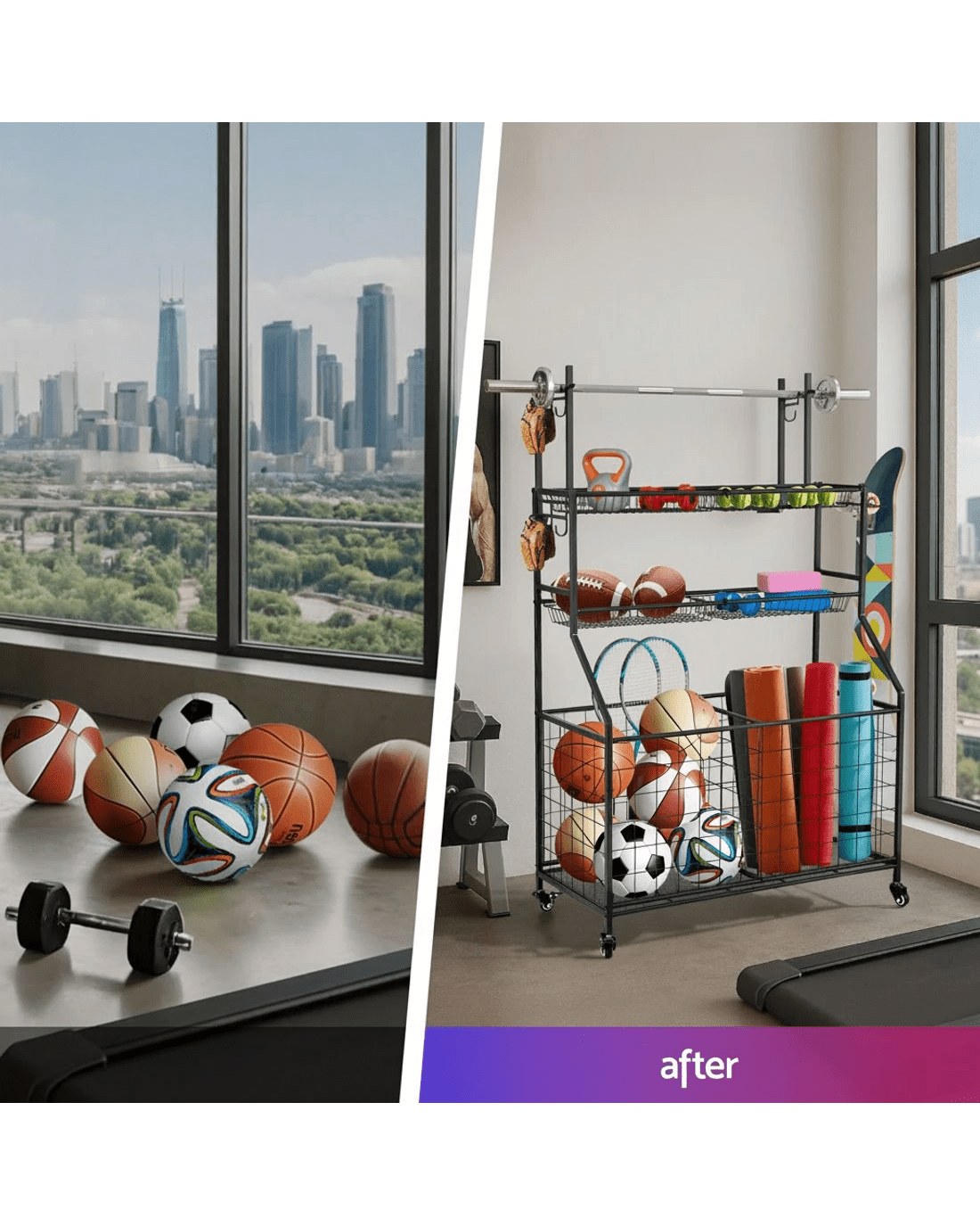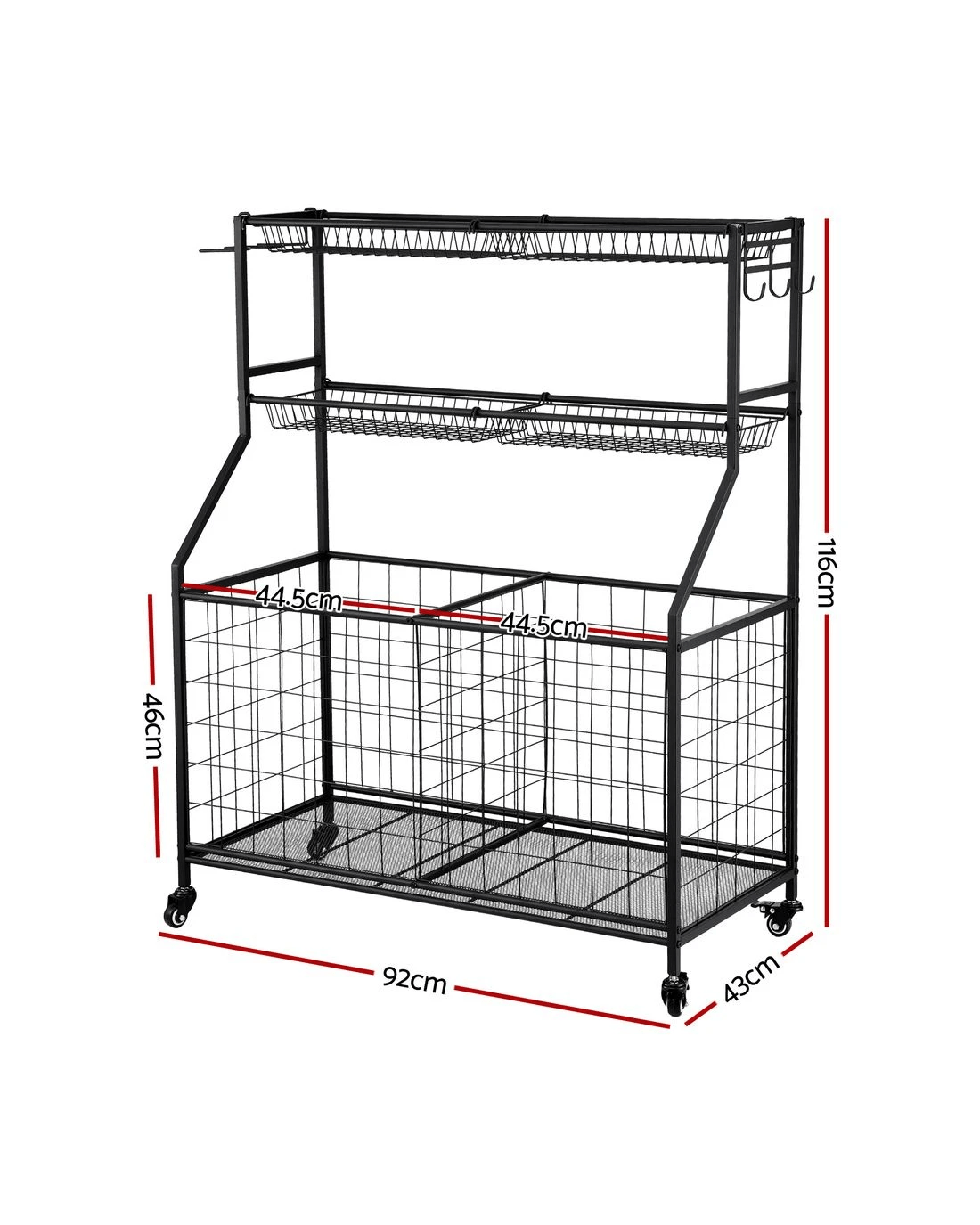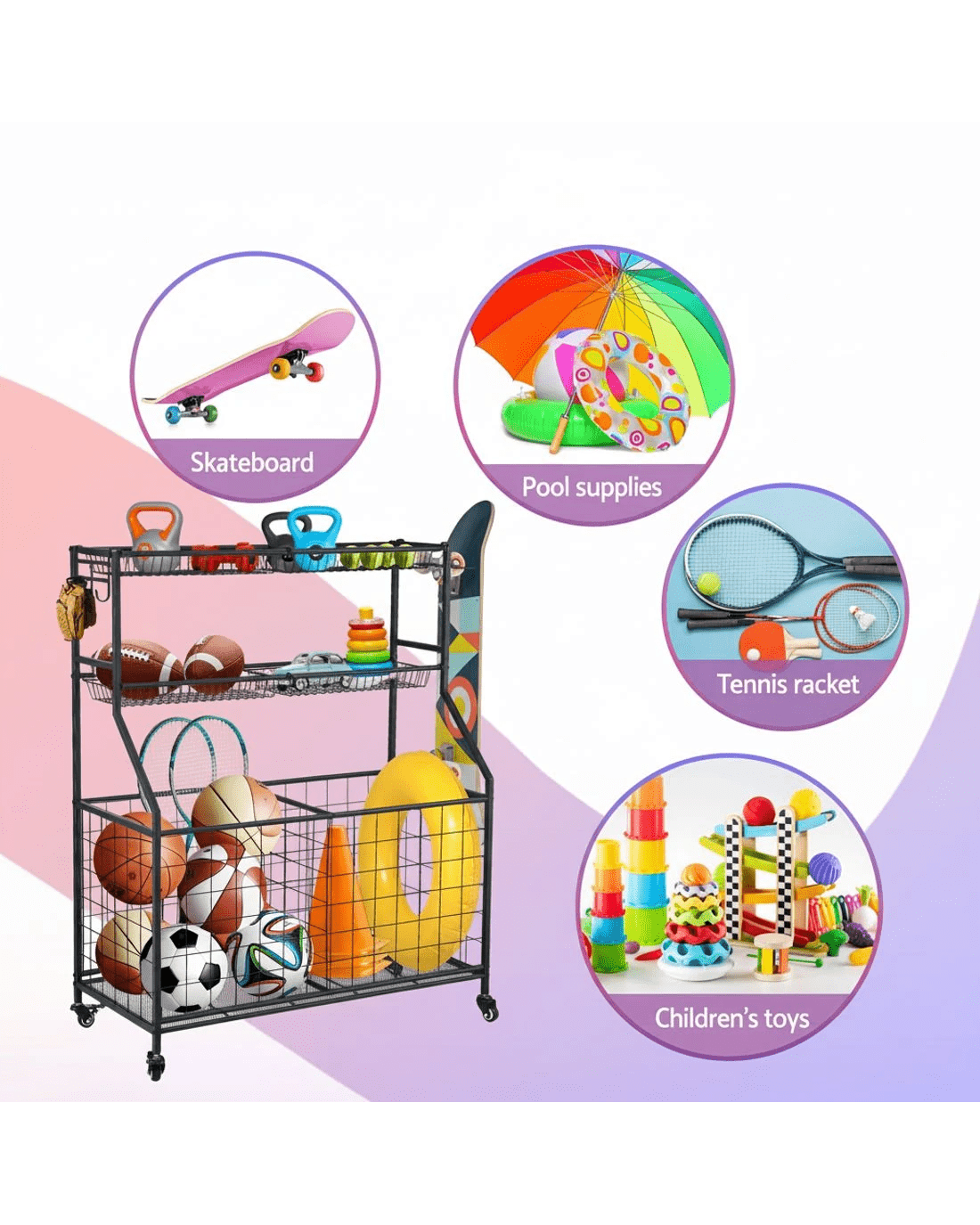 Organize all sports gear with the Everfit Sports Equipment Organizer featuring dedicated compartments for balls, rackets and accessories. The sturdy steel frame with 4 swivel wheels allows easy mobility between garage, gym or backyard. Includes ventilated baskets for airflow and adjustable hooks for equipment. Compact design fits tight spaces while holding up to 80kg. Ideal for basketball, soccer, tennis and more.