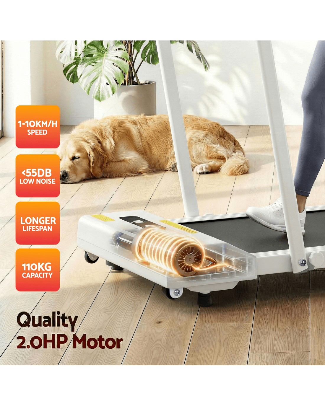 For a truly effective approach to weight loss and toning, our Everfit Walking Pad is your perfect companion. Compact and sturdy, the walking pad allows you to perform essential cardio exercises within the comfort of your home. It is foldable, easy to move, and comes ready to hit the ground running – no assembly required. Controlled by either the companion app or remote control, set up speeds of between 1km/h and 10km/h and monitor speed, time, distance and calories. Its powerful and energy-efficient motor produces smooth and seamless operation and the anti-slip belt phone holder makes your session a comfortable and controlled experience. The running belt uses an enhanced shock control system to help reduce the risk of joint injury, making the walking pad suitable for adults and seniors. When all the hard work is done, easily fold and store away the compact walking pad. Other great features include smooth wheels for easy mobility and Bluetooth speakers for entertainment while exercising. For health results that matter, our fitness walking pad is the one to run to.