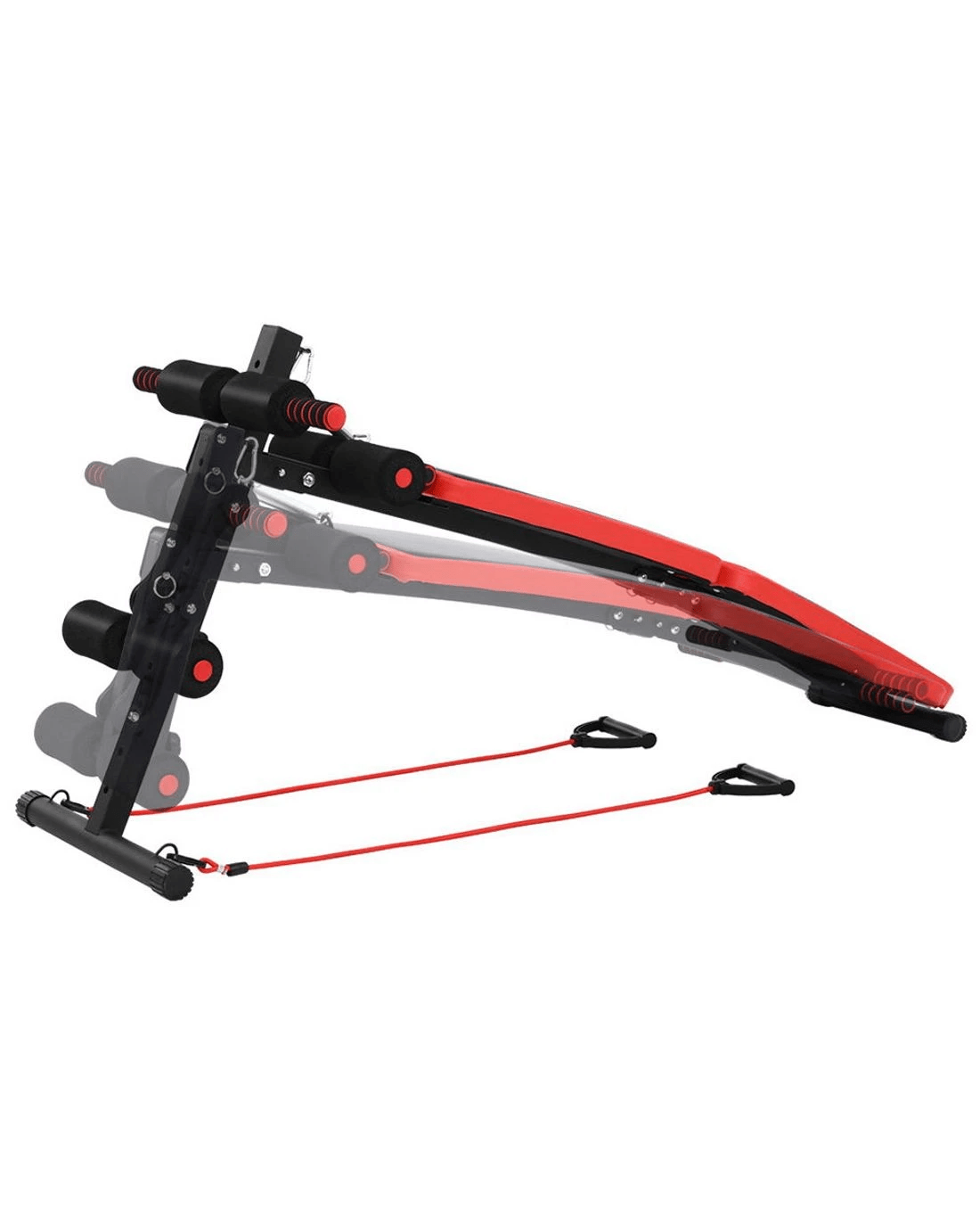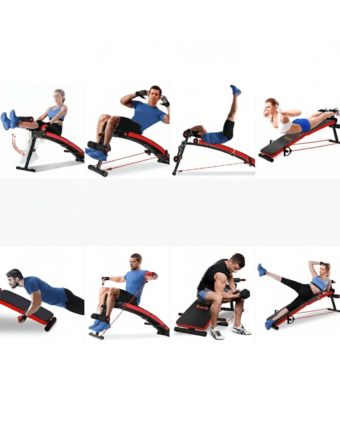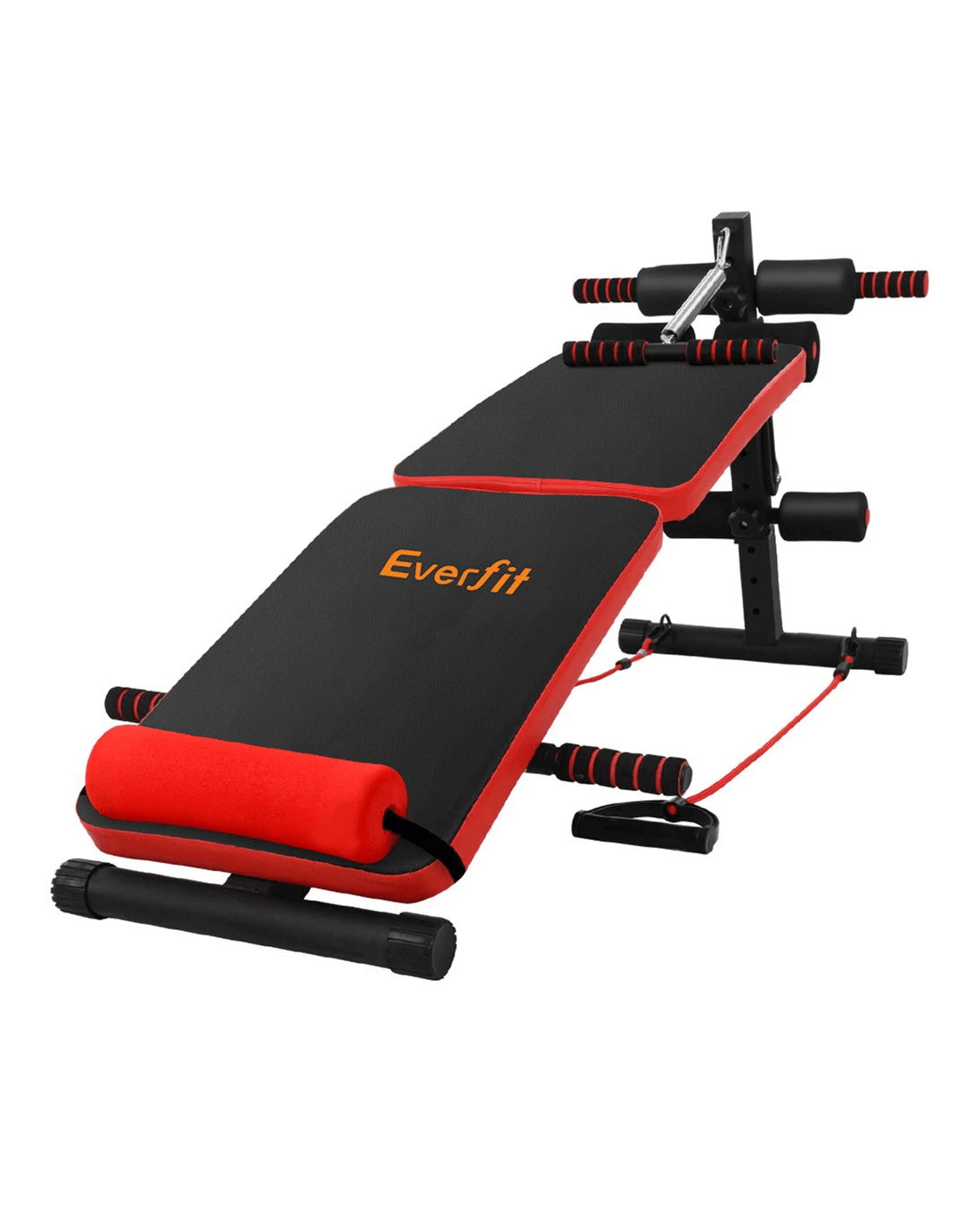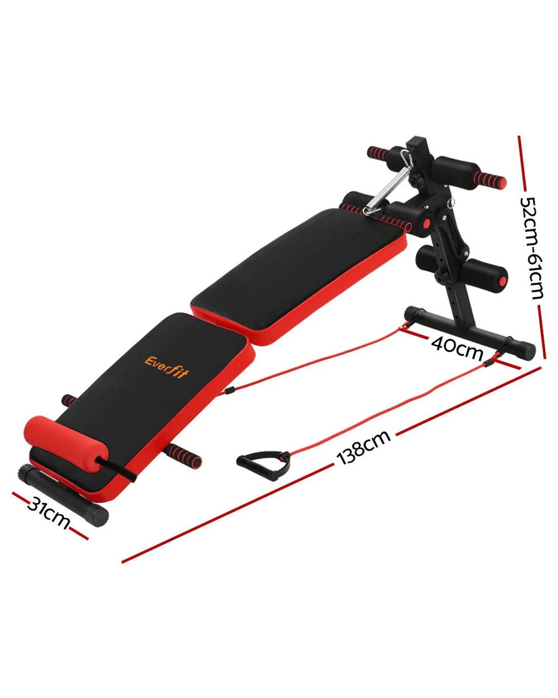 Our foldable multifunction Everfit Sit-up Bench is the ultimate fitness equipment to complete your home fitness workout. The highly versatile and compact workout station not only helps with toning and strengthening your muscles, it also helps improving efficiency of your cardio-vascular system and burning extra calories and reducing fat faster. The intensity of workout can be easily and quickly adjusted by using the pop pin to adjust the angle of the bench. Featuring durable powder-coated steel tube construction, waterproof and oil-resistant PU leather and non-slip feet, the sit-up bench can easily withstand even high-intensity exercises. It also comes with bonus resistance bands to add variety to your workout. And best of all, the bench is fully foldable and portable, and highly convenient for storage.