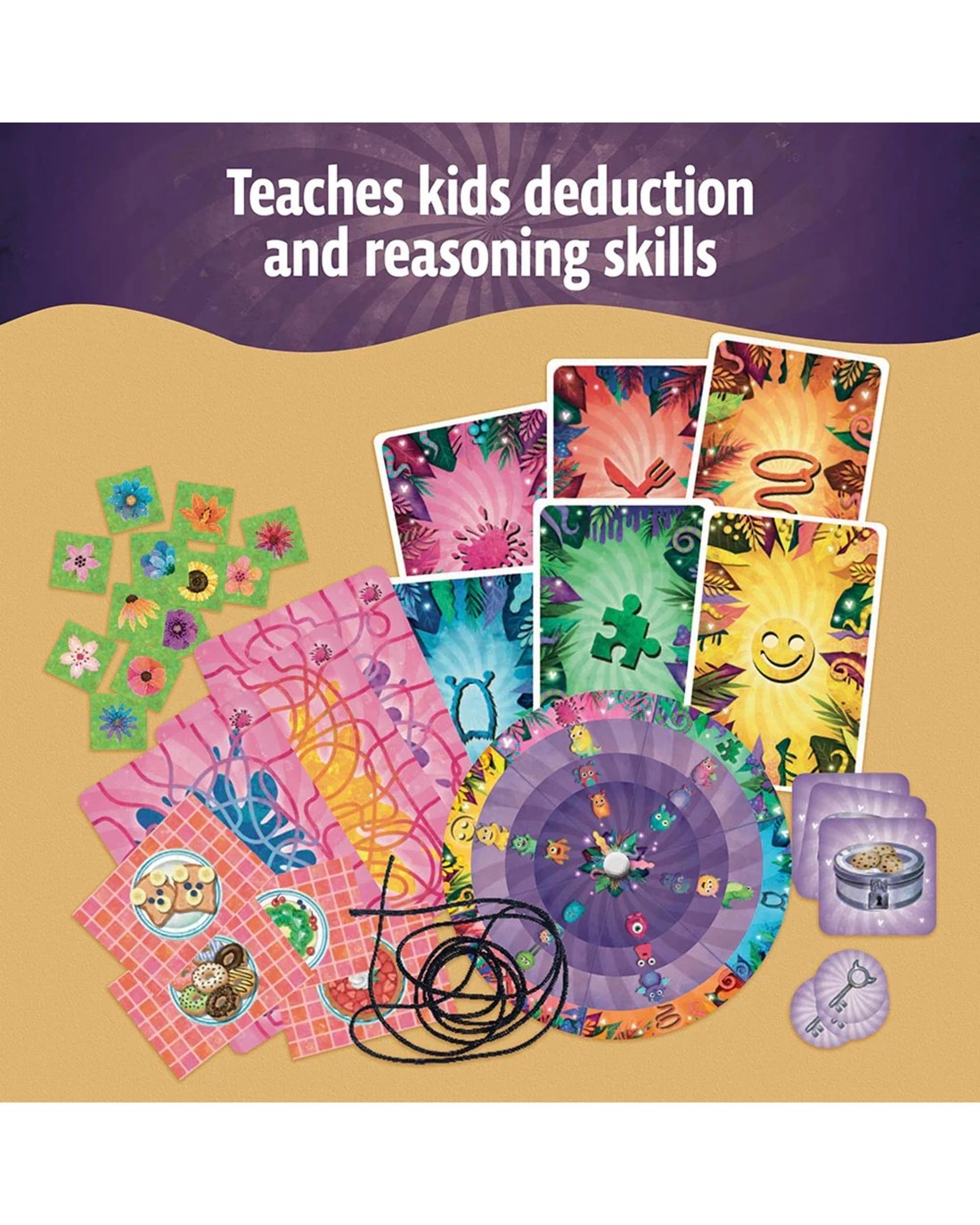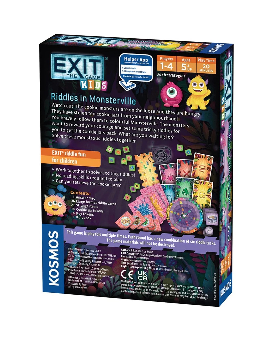 Watch out! The cookie monsters have stolen ten cookie jars from your neighborhood and are on the loose! Can you solve their monstrous riddles and earn the cookie jars back? Working together or by themselves, children ages five and up solve various riddles to open the cookie jars. The six different types of visual puzzles, which are shown on 36 illustrated, large-format cards, are combined in new ways each round. Use the simple decoder wheel to determine if your solution is correct. What are you waiting for? Get going to Monsterville! Ages: 5 + | Players: 1 - 4 | Playtime: 20 Mins