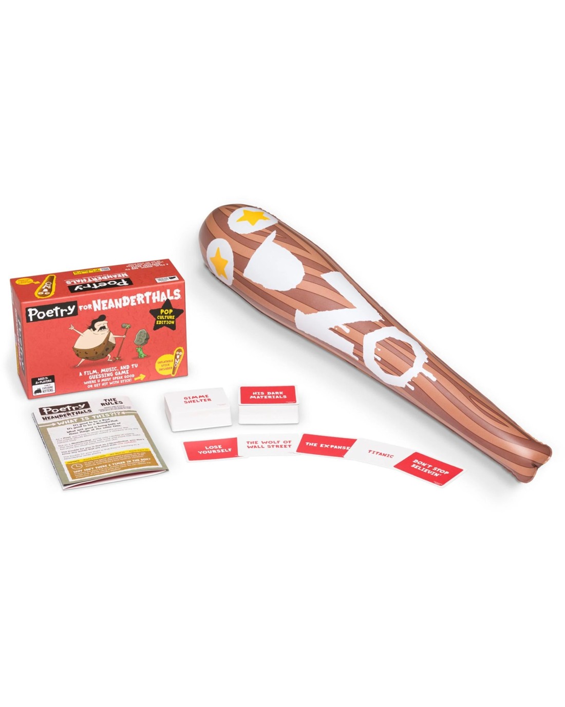 A film, music, and TV guessing game where U must speak good or get hit with stick. This game is perfect for everyone who hasn't been living under a rock! Similar to Taboo ®, the goal is to get your teammates to guess a word or phrase related to film, music, and TV. But the silly stoneage twist is, you can only use single-syllable words. If you use more than one syllable you'll get bopped with a 2-foot inflatable club! It's challenging but infinitely replayable. Great for breaking the ice at parties or adding energy to family game nights. Ages: 7 + | Players: 2 + | Playtime: 15 Mins