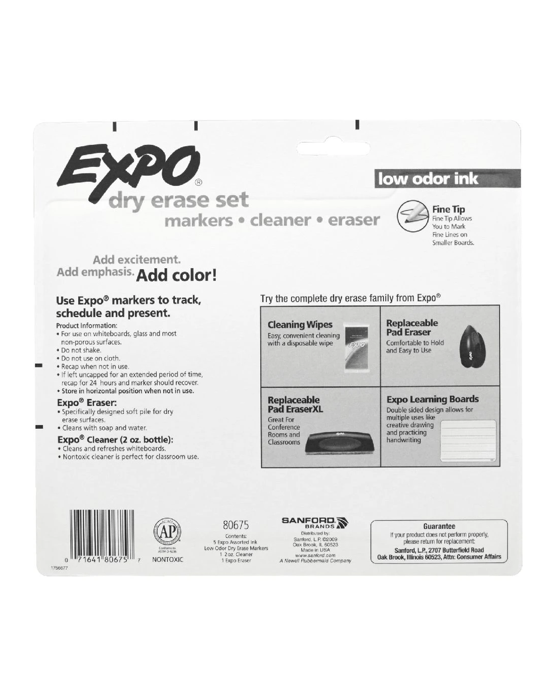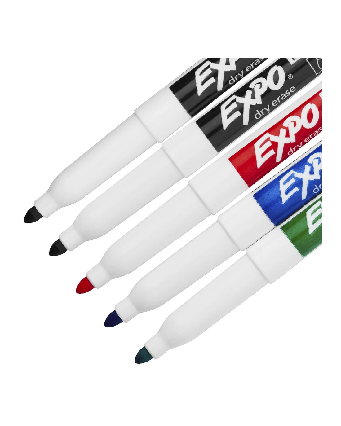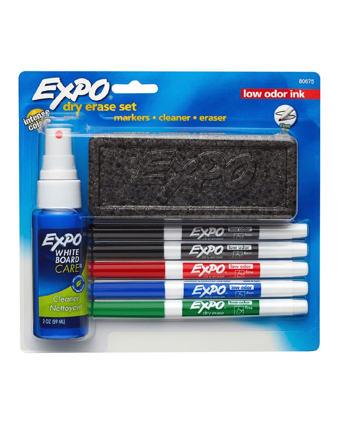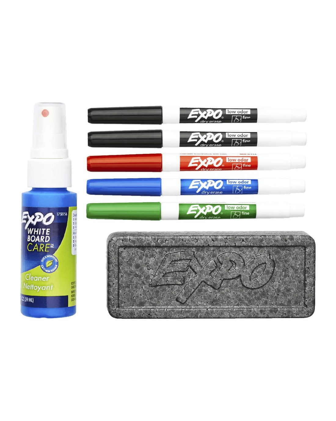 This Expo Whiteboard Marker Starter Set comes with 5 markers, an eraser and a cleaning spray bottle so you'll be able to get started writing on your whiteboard or other dry erase surface right away. Each marker contains specially formulated ink that's designed to be visible from across the room.
