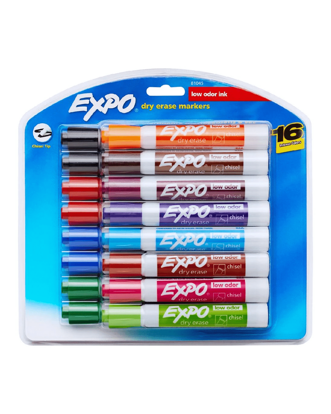 The Expo Chisel Whiteboard Markers are made with specially formulated ink that is non-toxic, quick drying and smear proof. With 16 coloured markers in this pack, you can enjoy the broad, medium and fine writing options thanks to the chisel tips.