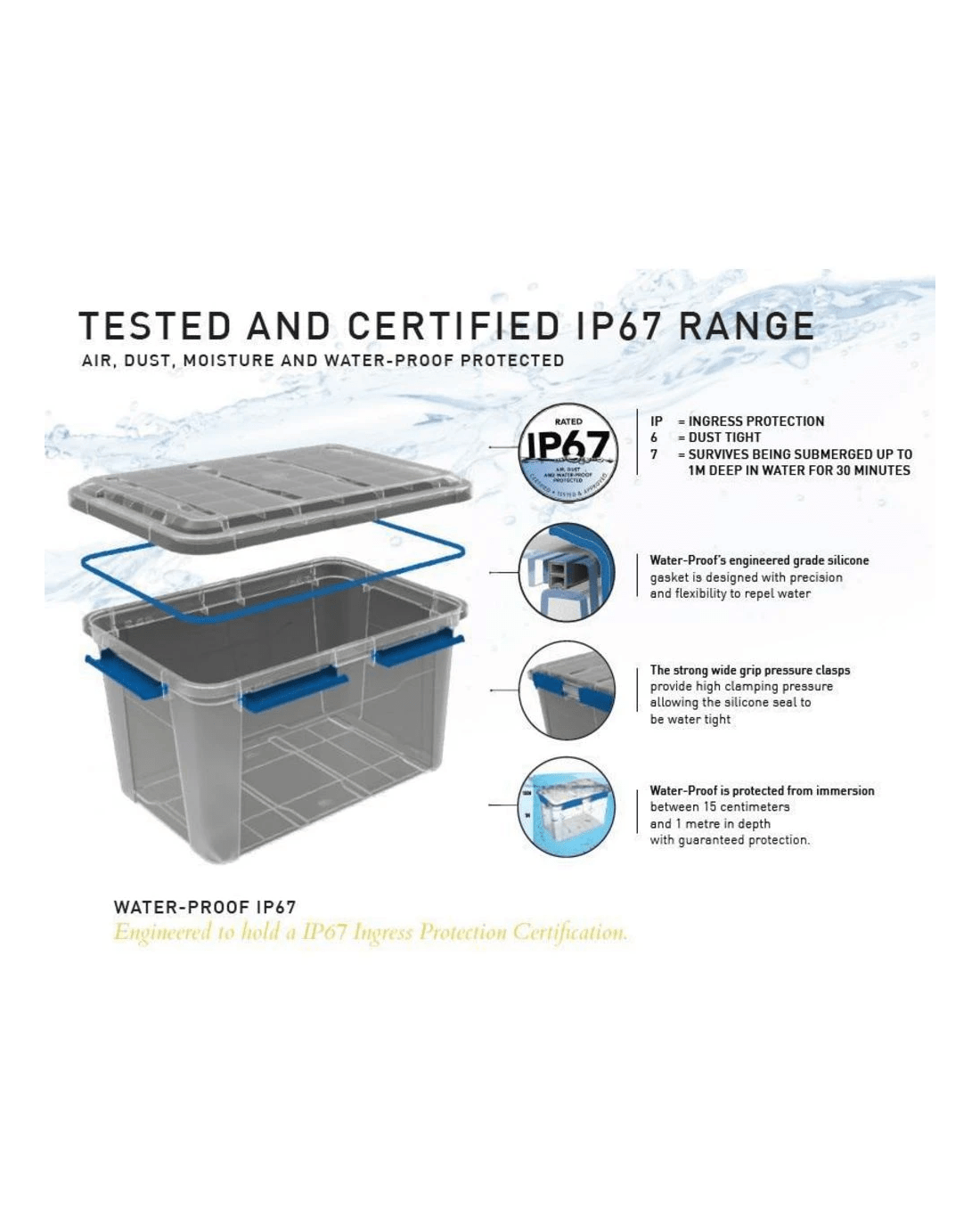 Protect your belongings from moisture and dirt with our range of Ezy Storage Waterproof IP67 storage containers, they are ideal for any workplace office storage, anywhere around the home and garage, as well as for camping or boating. The strong pressure clasp latches provide high clamping pressure allowing the silicone seal to be watertight and are perfect for damp storage areas. The Waterproof engineered grade silicone gasket is designed with precision flexibility and rebound to repel water and protect your valuables.