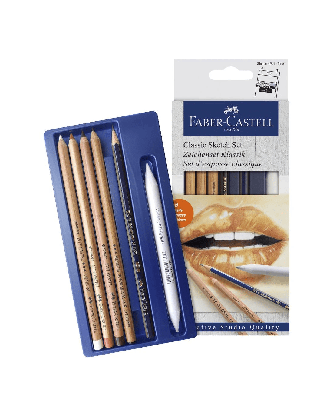 - There are 6 pieces in this set including a pencil, 3 pastel pencils, 1 oil base pencil and a blending stump.