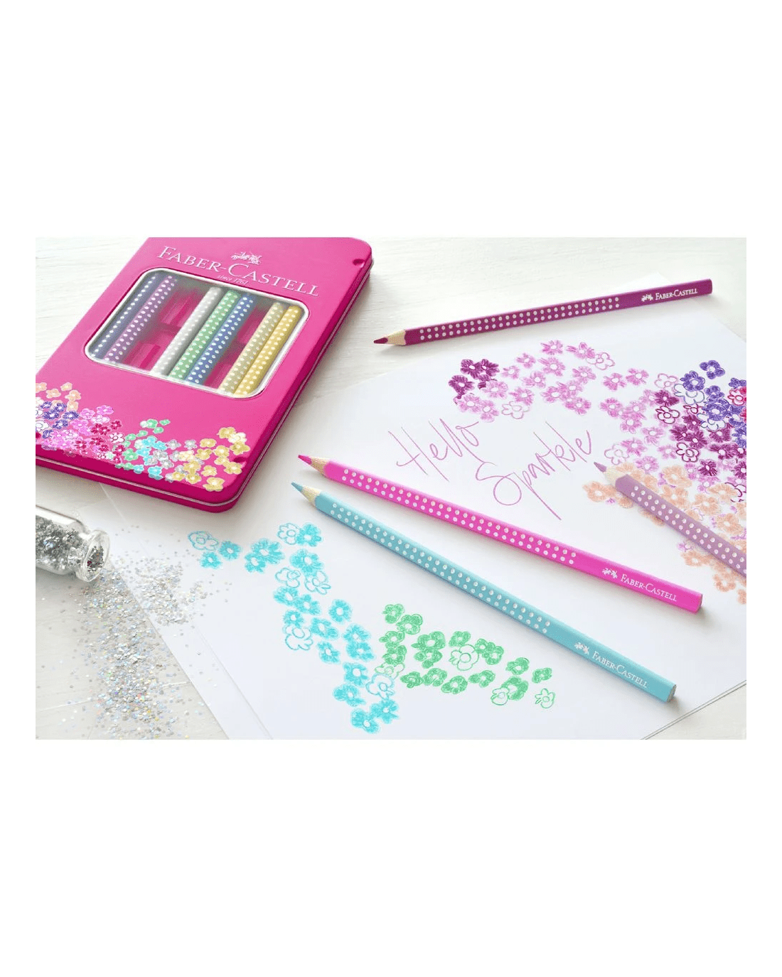 These Faber-Castell Triangular Grip Coloured Pencils offer a comfortable writing experience thanks to their triangular barrel and soft grip zone. With pigmented leads that are fascinatingly bright and break-proof, enjoy hours of uninterrupted creativity. This pack includes 12 coloured pencils featuring a sparkle design in a high-quality tin.