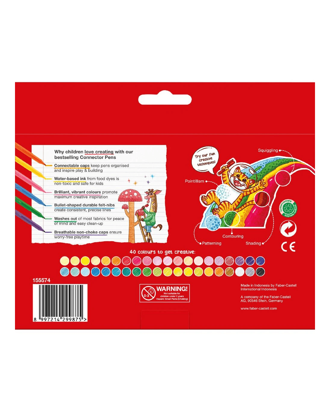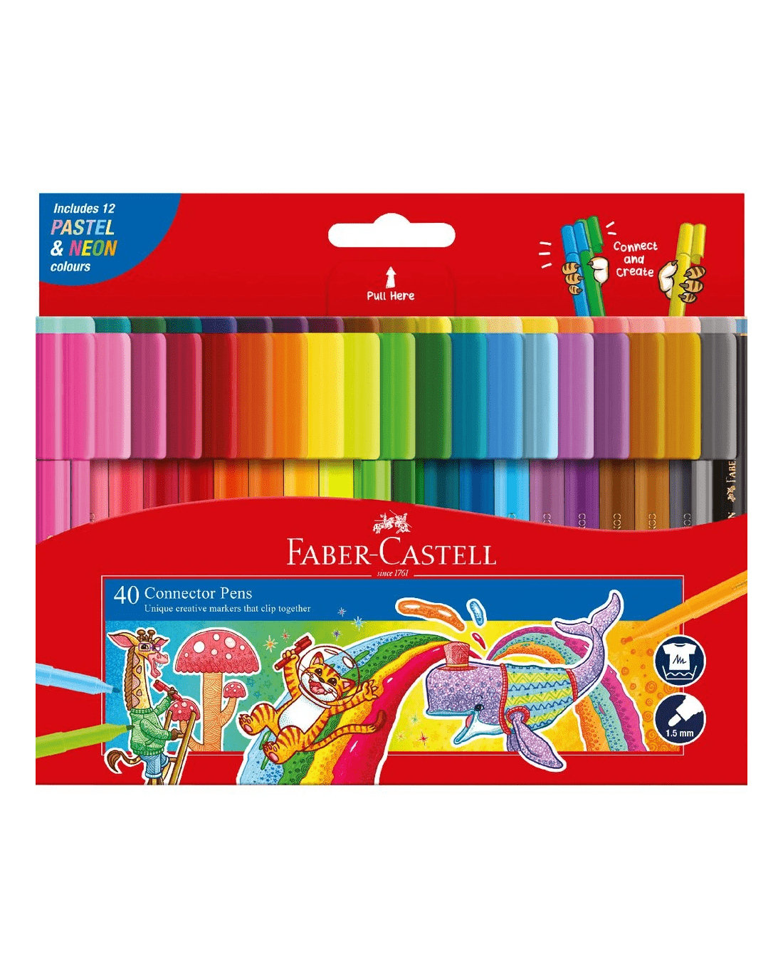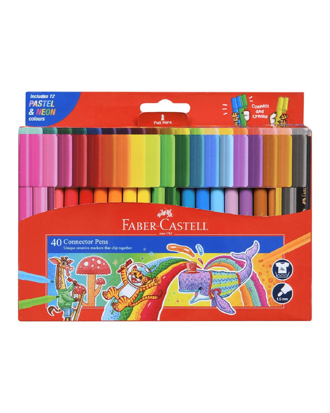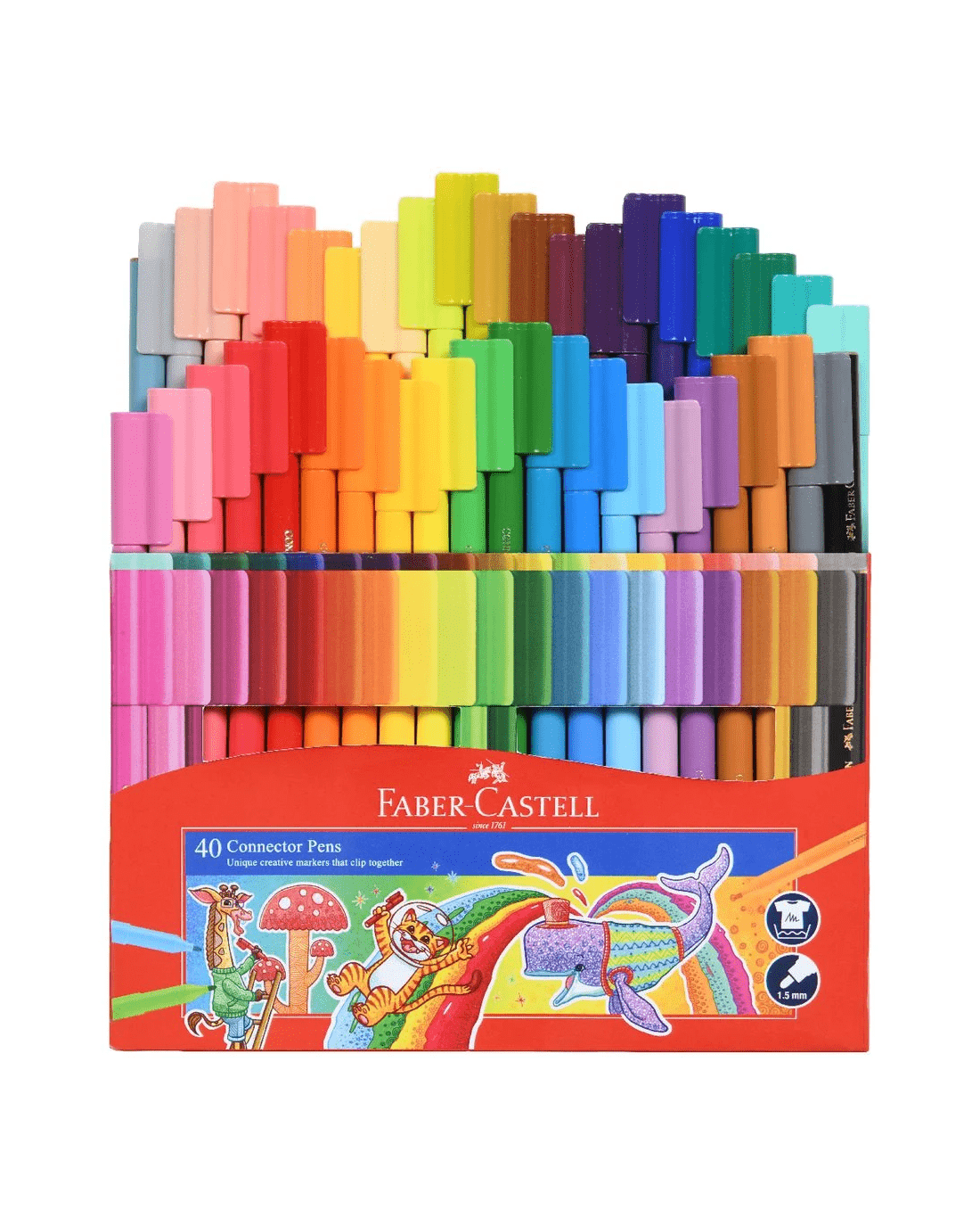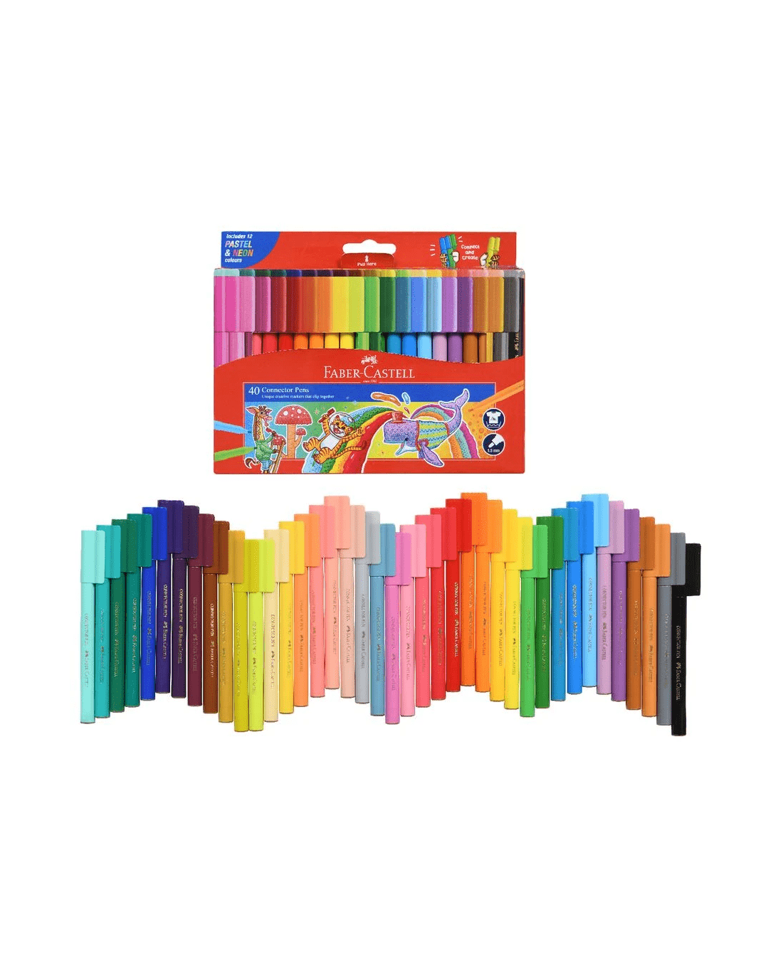 Faber-Castell Connector Pens feature a unique cap design which clicks the pens together so you can have fun building things while you're drawing and colouring. This pack includes 40 bright and fun colours which are washable and non-toxic.