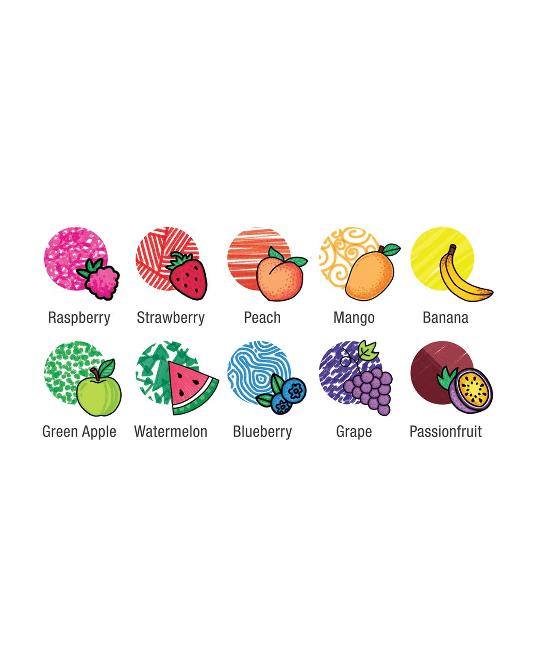 - Each pen includes a unique fruity scent such as raspberry, strawberry, peach, mango, banana, green apple, watermelon, blueberry, grape, and passionfruit.