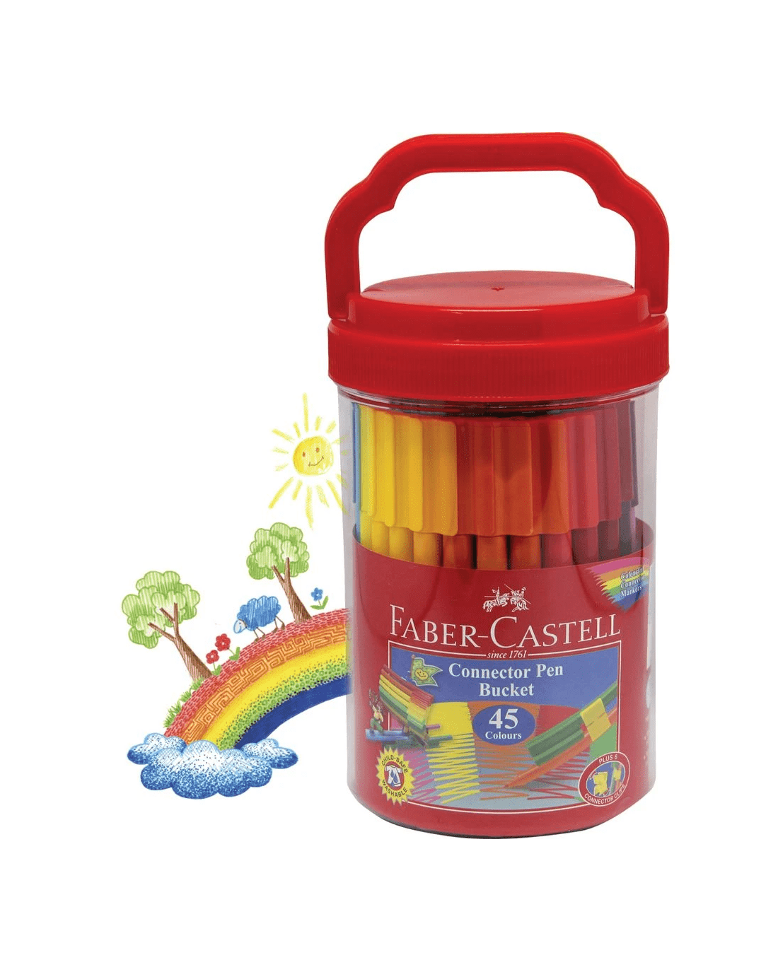 This bucket of Faber-Castell Connector Pens are ideal for colouring, drawing and creating art. These pens clip together so they can be easily kept in one place, and you can even make unique shapes out of them. The pens contain water-based ink that can be washed out of most fabrics.