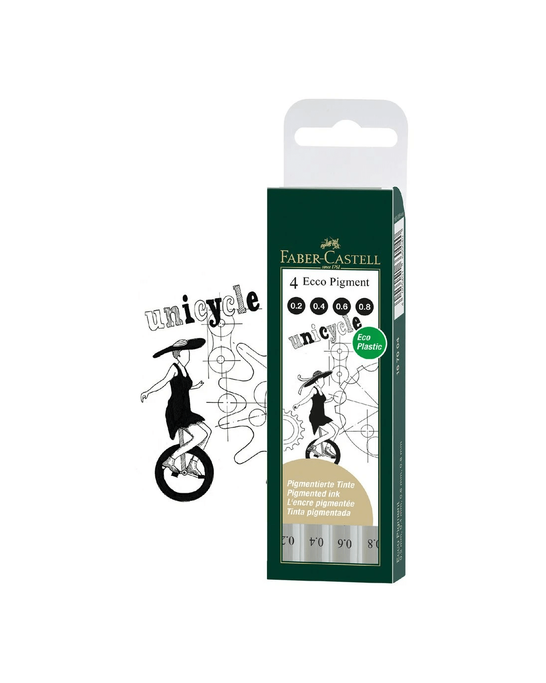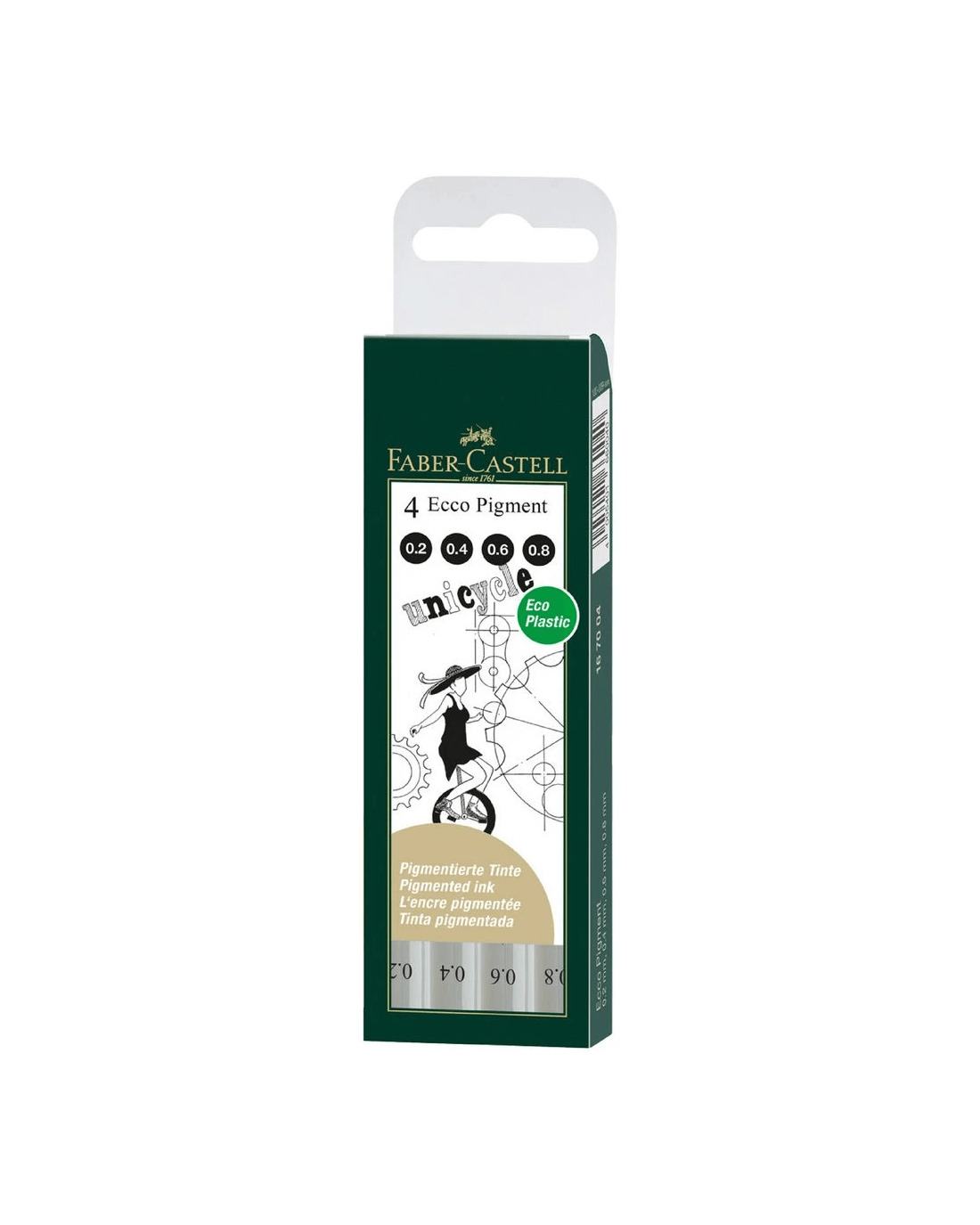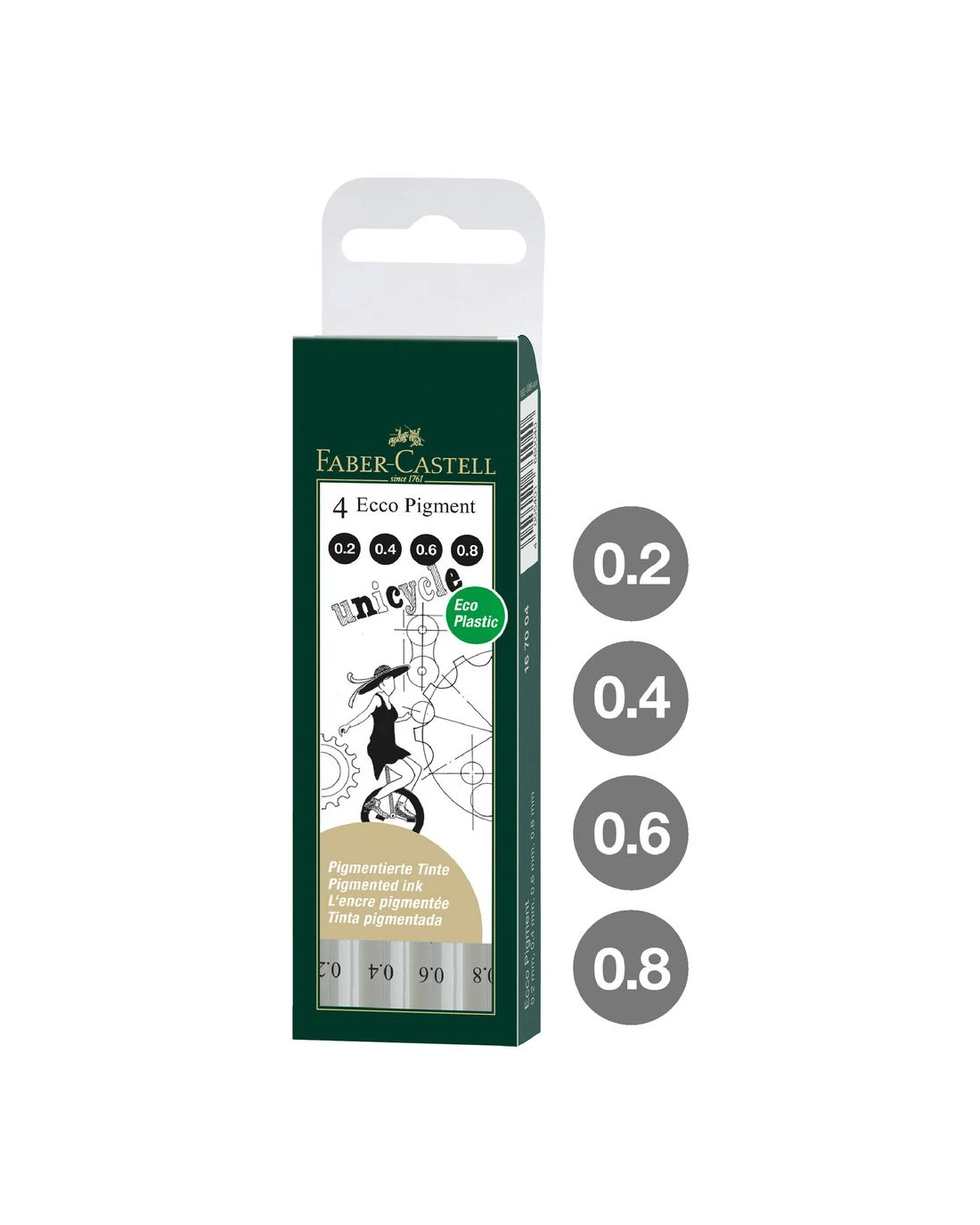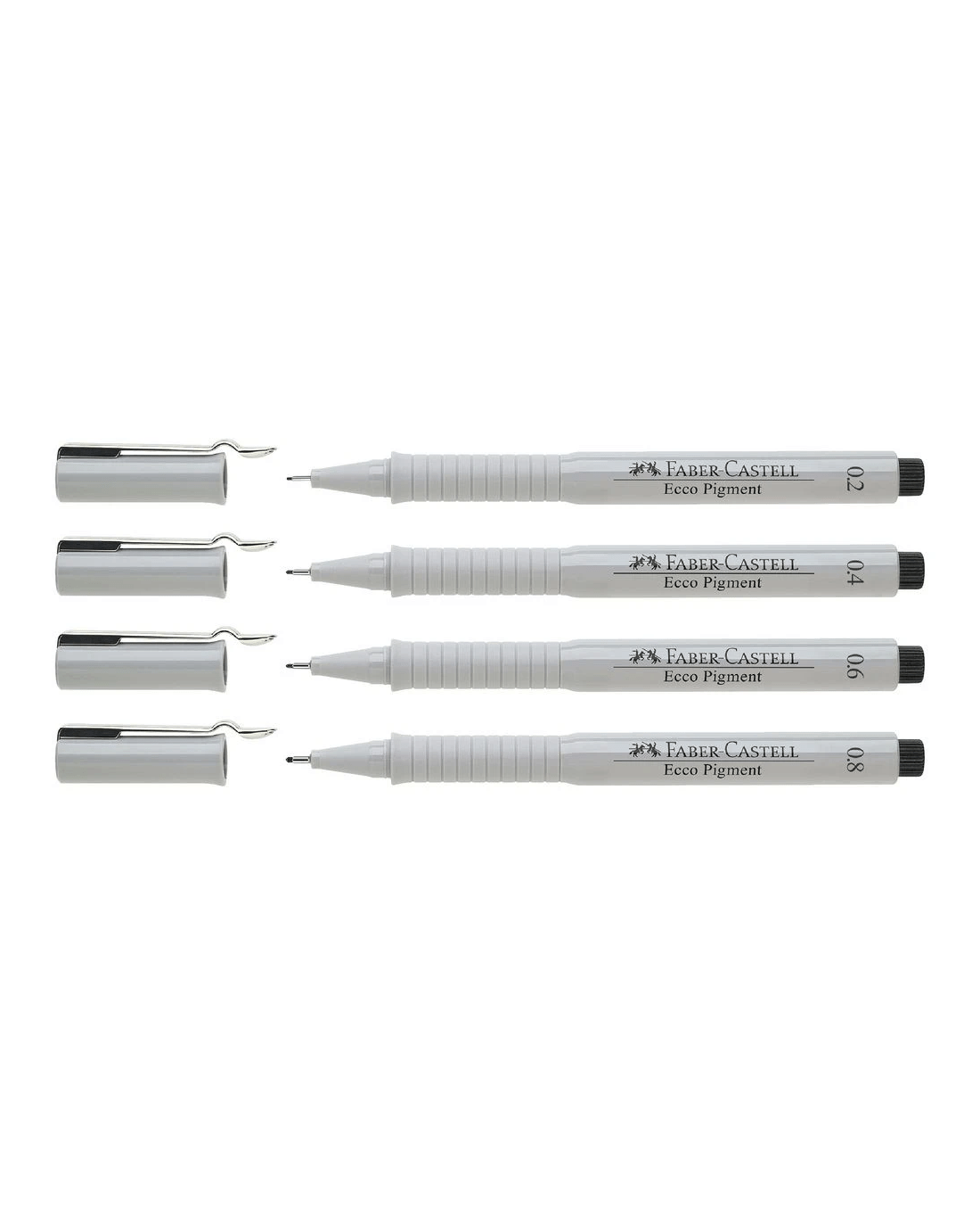 These Faber-Castell Ecco Pigment Fineliners are designed for use on drawing paper and are highly pigmented to create a rich ink tone. This pack contains a variety of nib sizes from 0.2 mm to 0.8 mm, so you can add different line sizes to your artwork or writing.