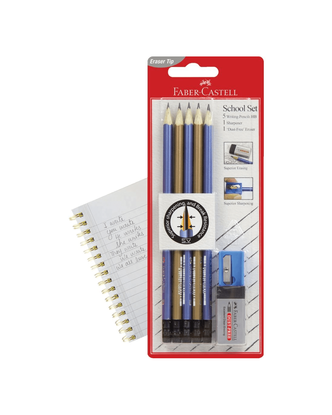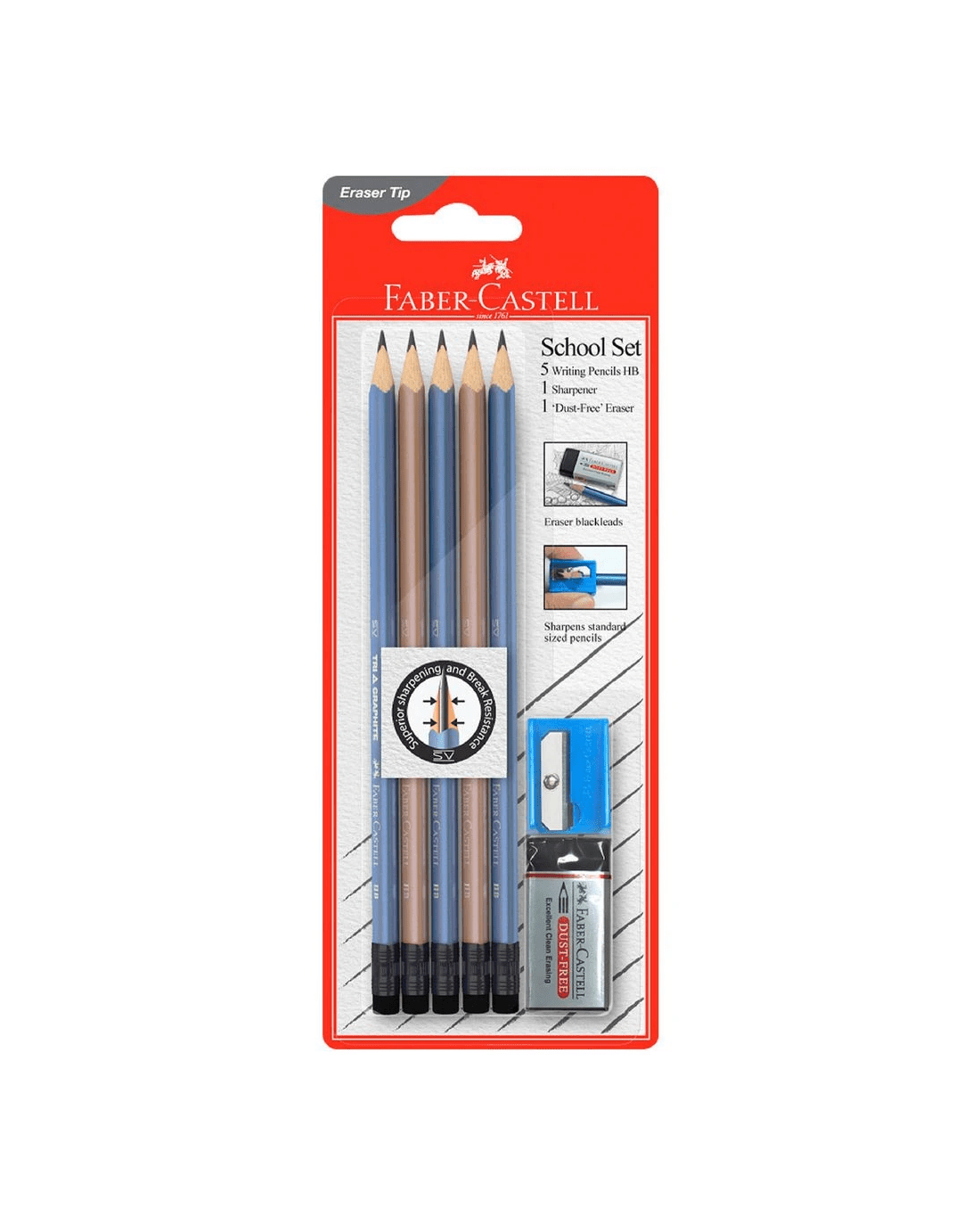 - The set contains 5 pencils, 1 dust free eraser and 1 sharpener.