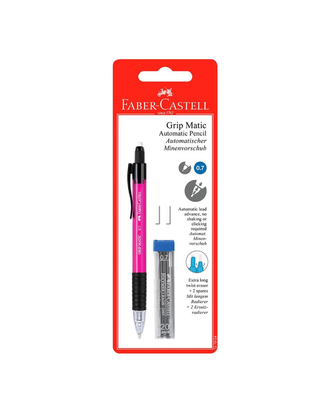 The Faber-Castell Grip Matic Pencil has an automatic lead advance feature so you don't have to click or twist for more lead, preventing waste and interruptions. It's ergonomic in design with a rubber non-slip grip and has a twist eraser on the end for fixing mistakes and errors.