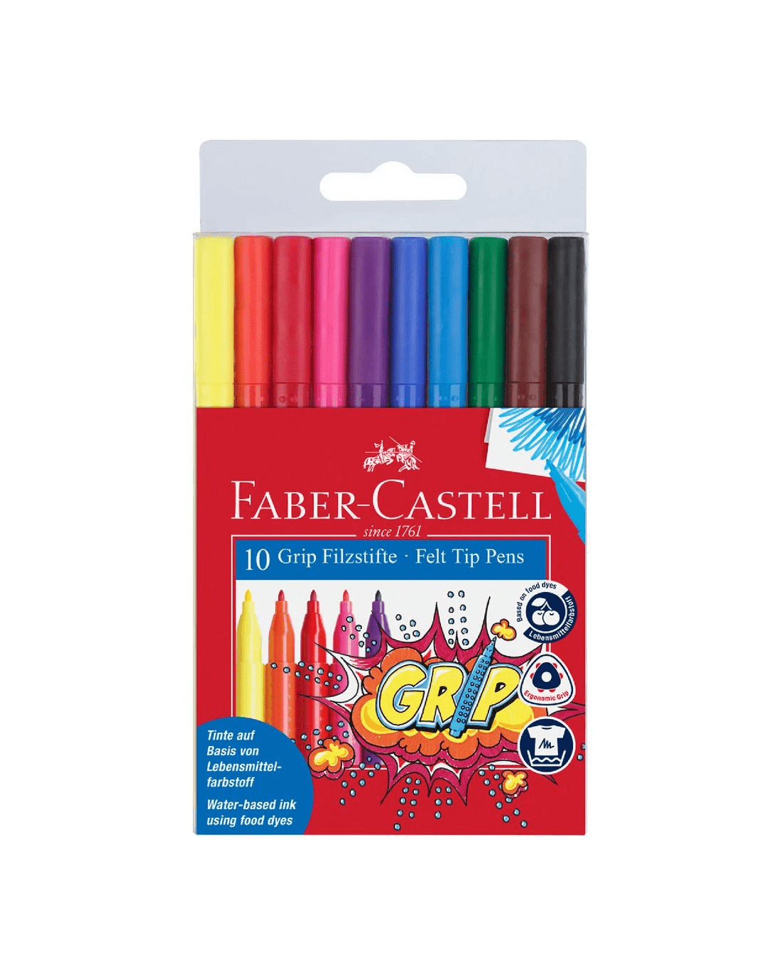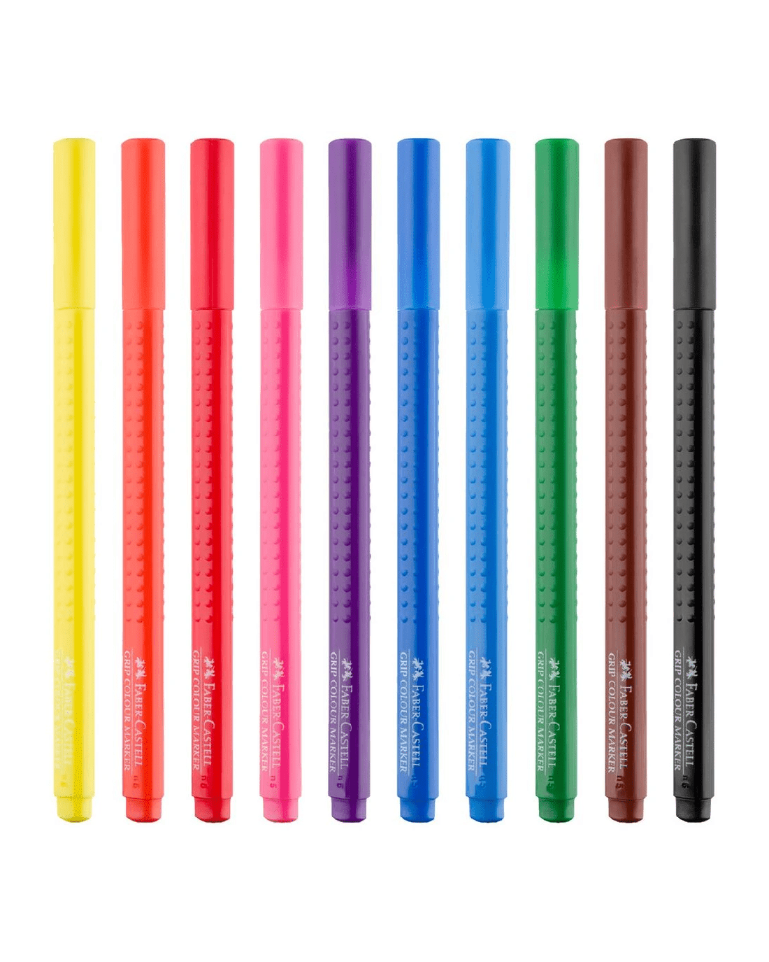 These Faber-Castell Triangular Grip Coloured Markers have a comfortable, gripped barrel which ensures that it will not slip out of your hand. These markers have bright ink inside their barrels that is non-toxic and will wash out of clothes and off skin. There are 10 markers of assorted colours in this pack.